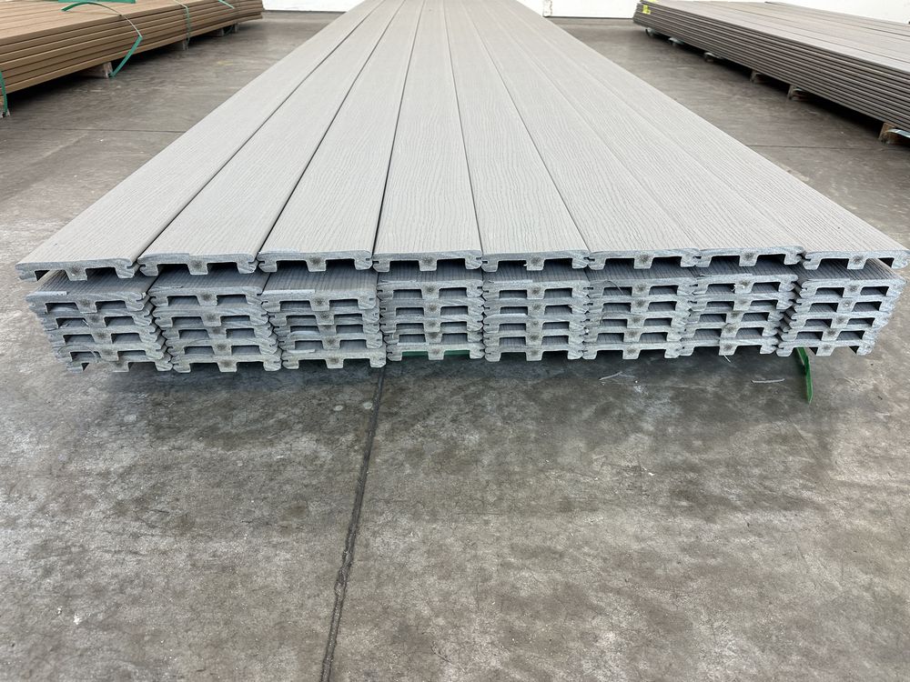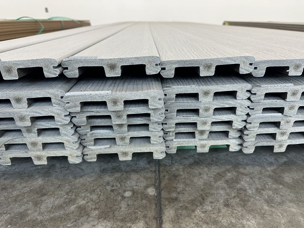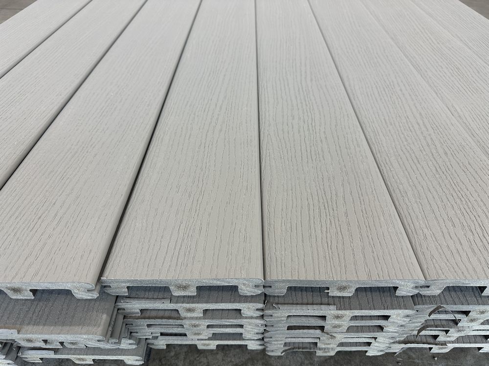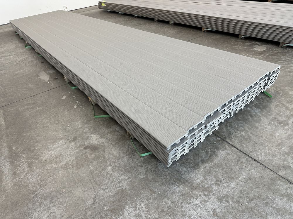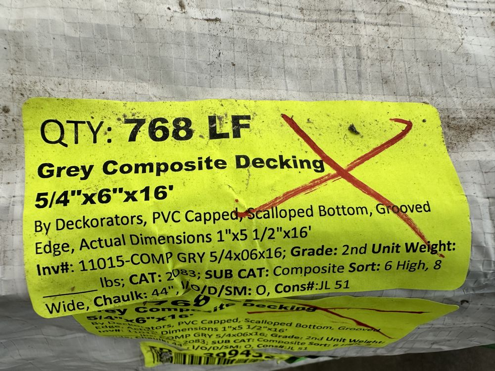 Grey Composite Decking 5/4"x6"x16'. By Deckorators, PVC Capped, Scalloped Bottom, Grooved Edge, Actual Dimensions 1"x5 1/2"x16', Grade: 2nd. Weight: x. Sold by: Linear Foot. Sold as: Price X Quantity. Inventory #: 11015-COMP GRY 5/4x06x16
