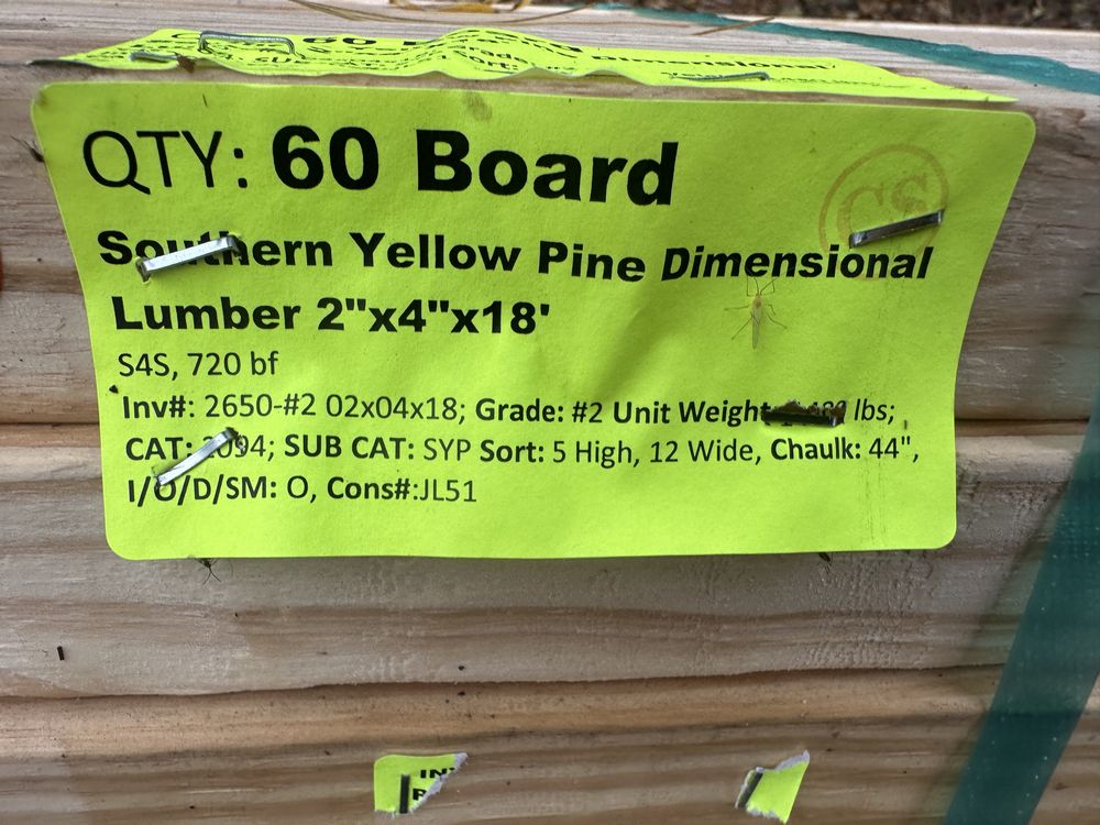 Southern Yellow Pine Dimensional Lumber 2"x4"x18'. S4S, 720 Board Foot, Grade: #2. Weight: 1480. Sold by: Board. Sold as: Price X Quantity. Inventory #: 2650-#2 02x04x18