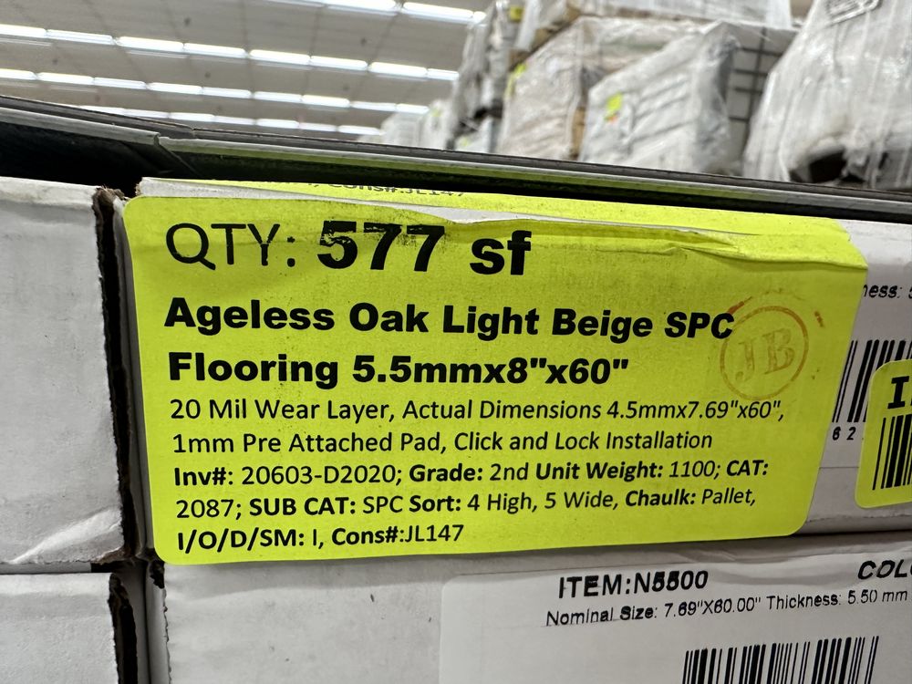 Ageless Oak Light Beige SPC Flooring 5.5mmx8"x60". 20 Mil Wear Layer, Actual Dimensions 4.5mmx7.69"x60", 1mm Pre Attached Pad, Click And Lock Installation, Grade: 2nd. Weight: 1100. Sold by: Square Foot. Sold as: Price X Quantity. Inventory #: 20603-D2020