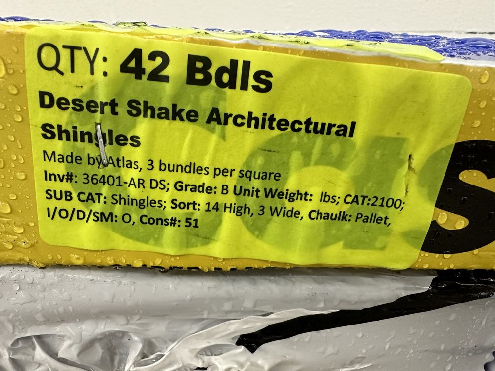 Desert Shake Architectural Shingles. Made By Atlas, 3 Bundles Per Square, Grade: B. Weight: x. Sold by: Bundle . Sold as: Price X Quantity. Inventory #: 36401-AR DS