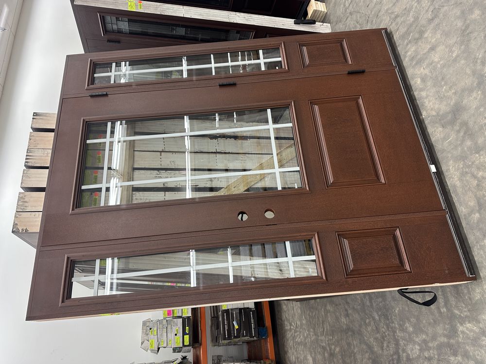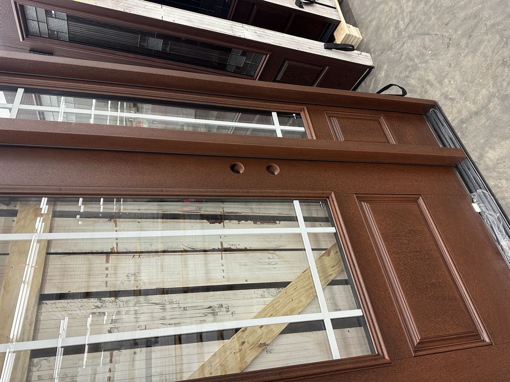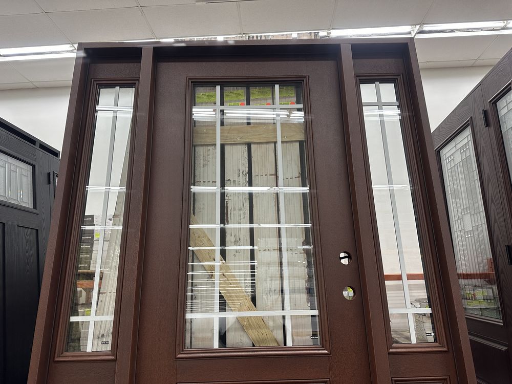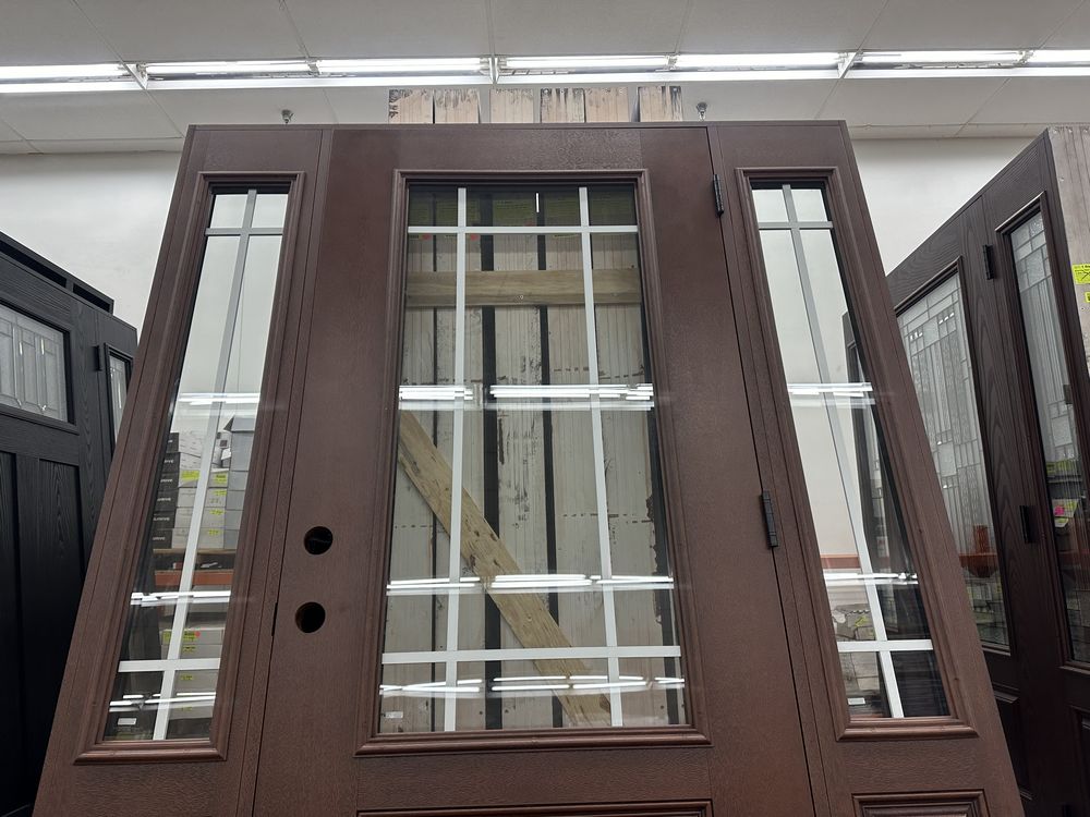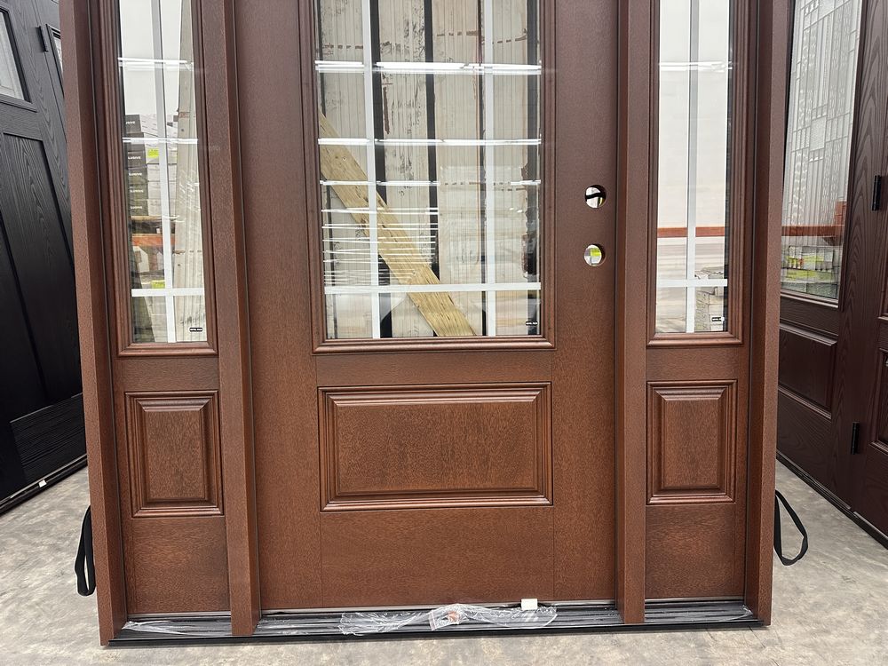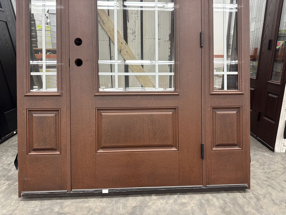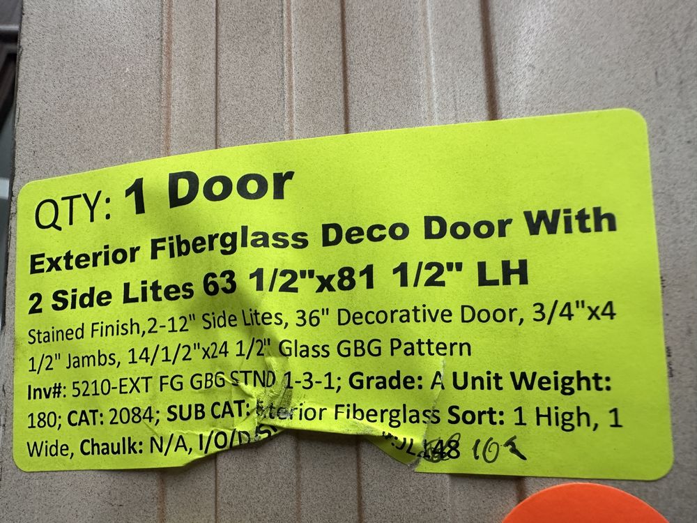 Exterior Fiberglass Deco Door With 2 Side Lites 63 1/2"x81 1/2" LH. Stained Finish, 2-12" Side Lites, 36" Decorative Door, 3/4"x4 1/2" Jambs, 14 1/2"x24 1/2" Glass, GBG Pattern, Grade: A. Weight: 180. Sold by: Door. Sold as: Price X Quantity. Inventory #: 5210-EXT FG GBG STND 1-3-1