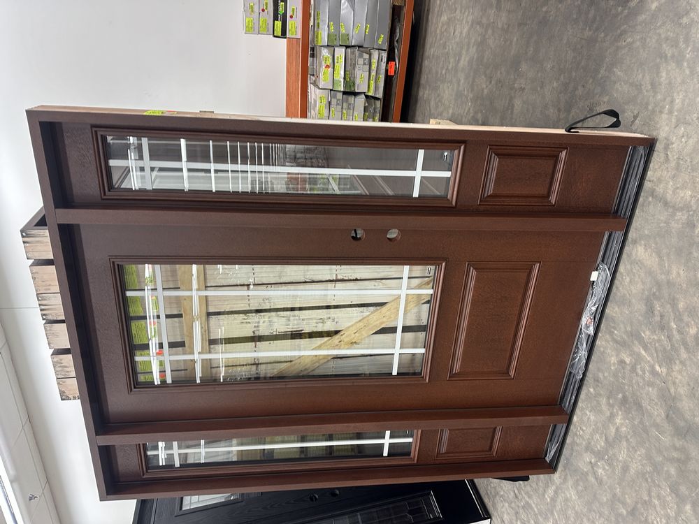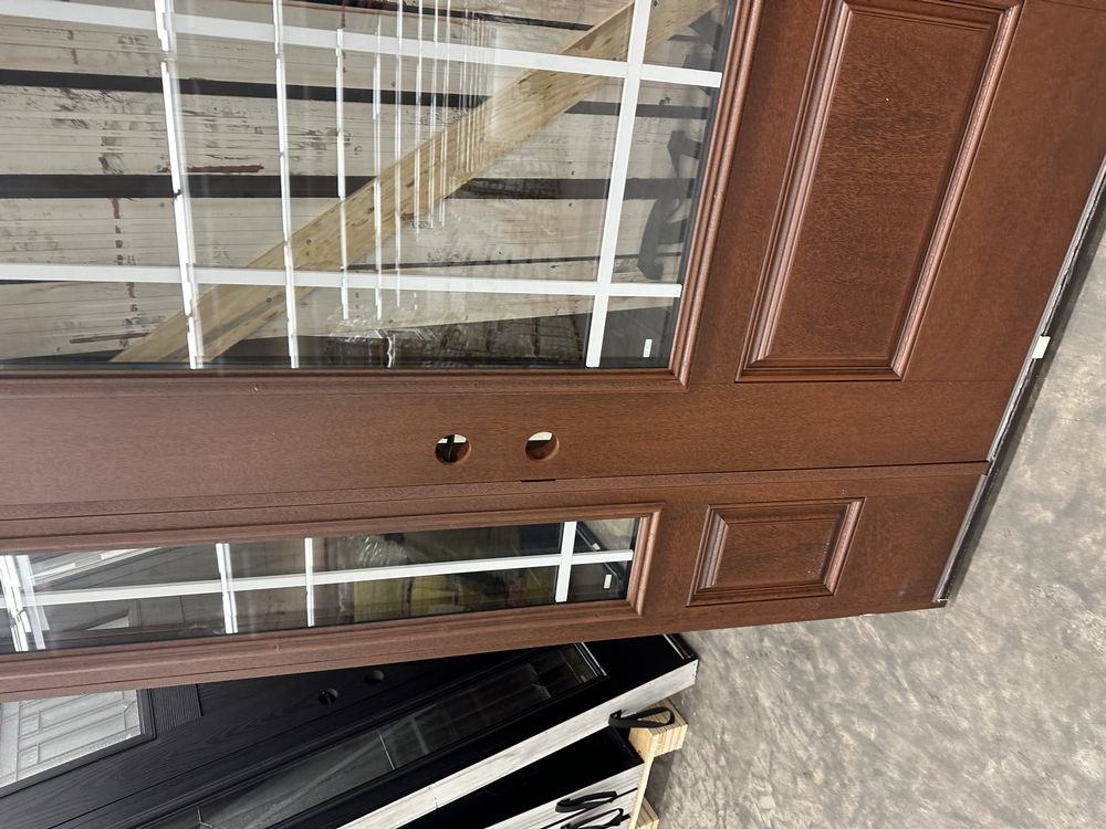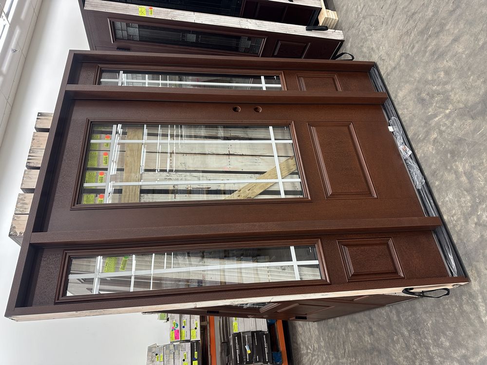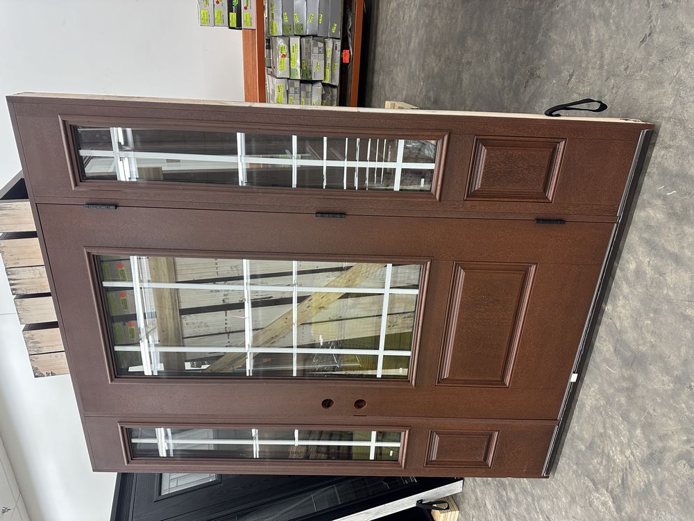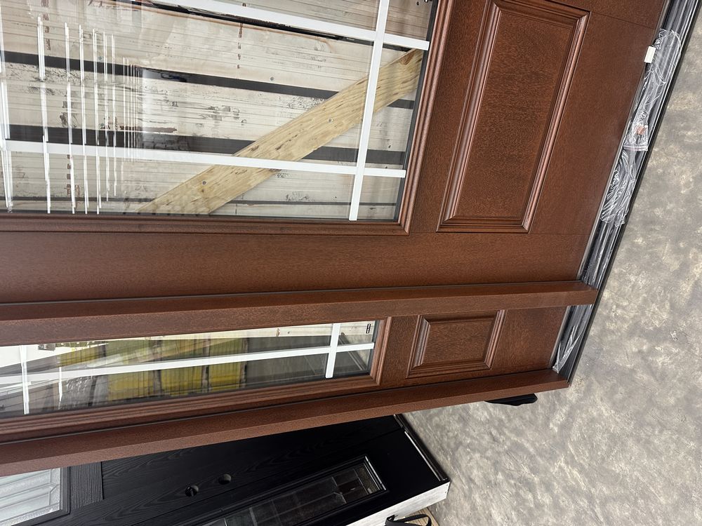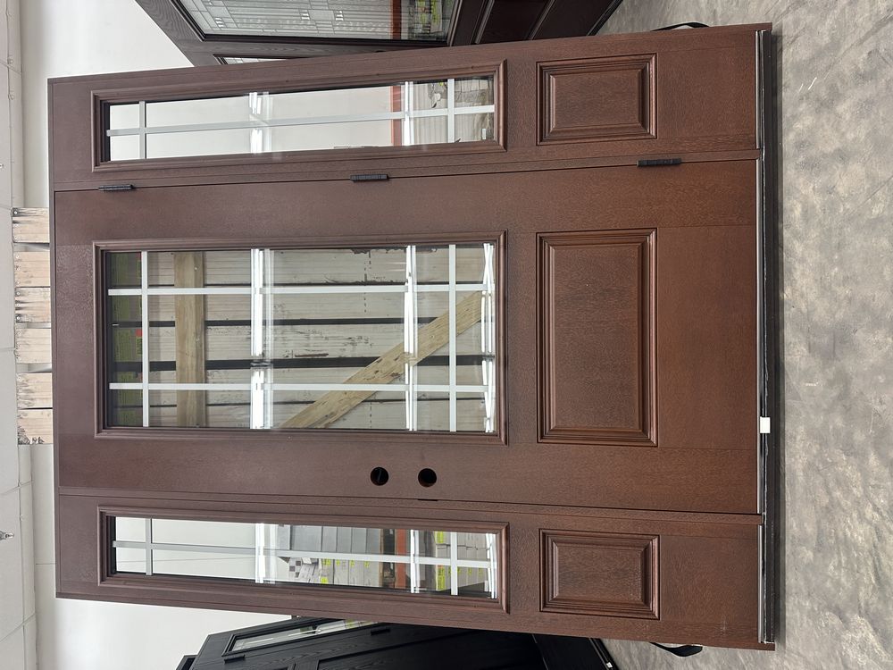 Exterior Fiberglass Deco Door With 2 Side Lites 63 1/2"x81 1/2" LH. Stained Finish, 2-12" Side Lites, 36" Decorative Door, 3/4"x4 1/2" Jambs, 14 1/2"x24 1/2" Glass, GBG Pattern, Grade: A. Weight: 180. Sold by: Door. Sold as: Price X Quantity. Inventory #: 5210-EXT FG GBG STND 1-3-1