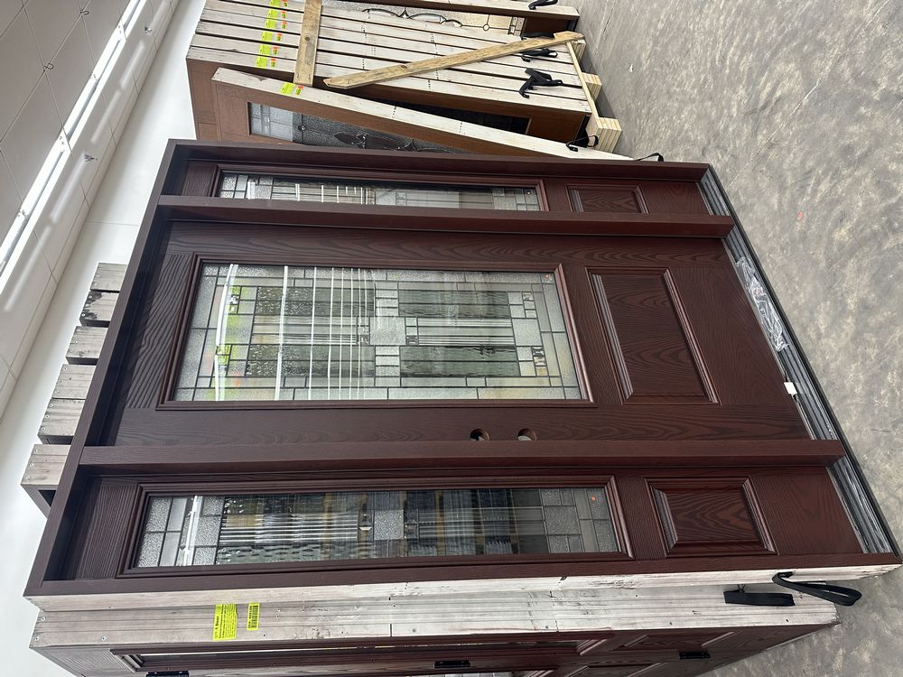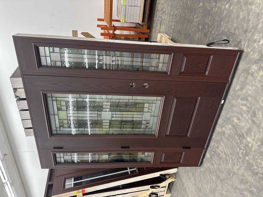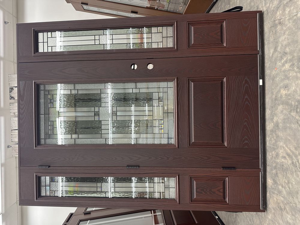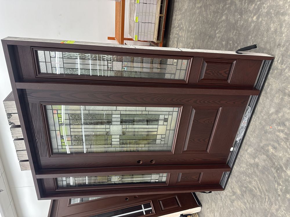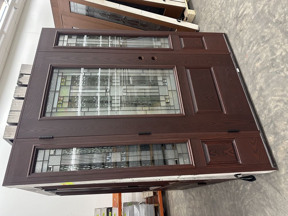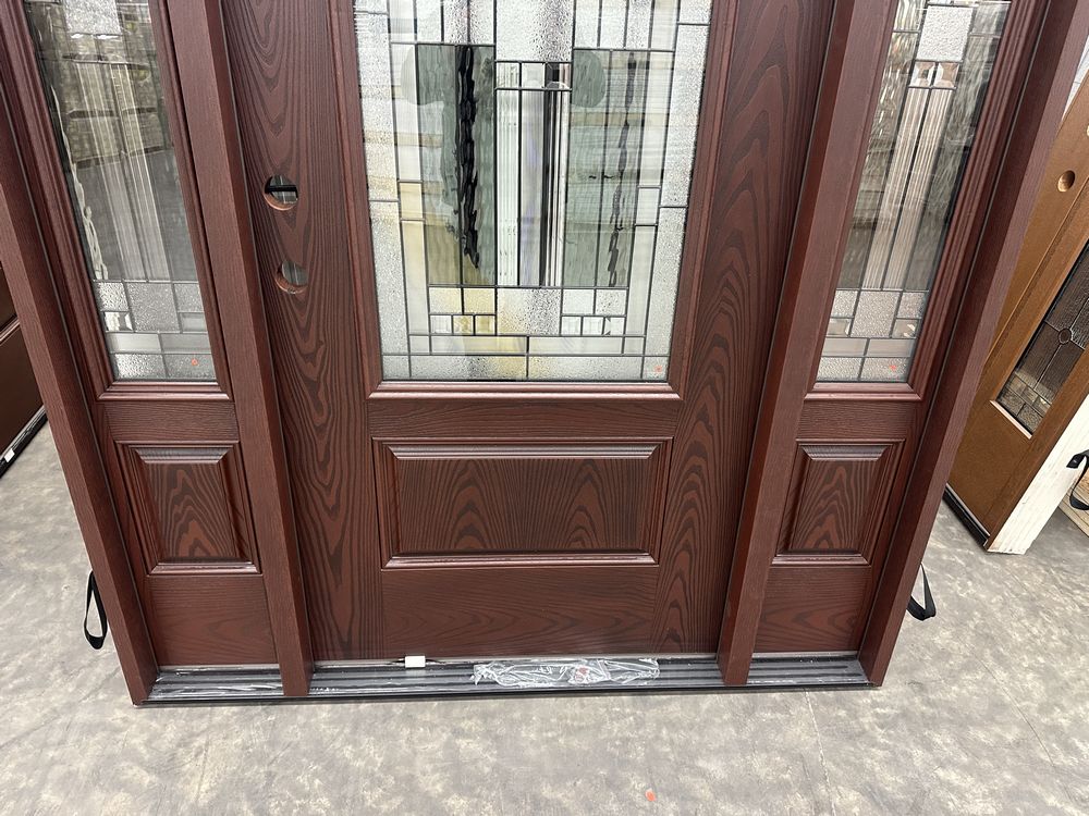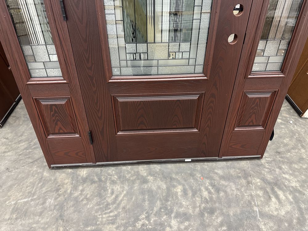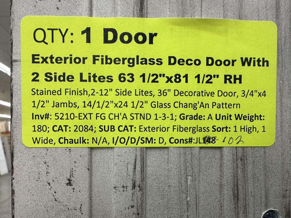 Exterior Fiberglass Deco Door With 2 Side Lites 63 1/2"x81 1/2" RH. Stained Finish, 2-12" Side Lites, 36" Decorative Door, 3/4"x4 1/2" Jambs, 14 1/2"x24 1/2" Glass, Chang'An Pattern, Grade: A. Weight: 180. Sold by: Door. Sold as: Price X Quantity. Inventory #: 5210-EXT FG CH'A STND 1-3-1