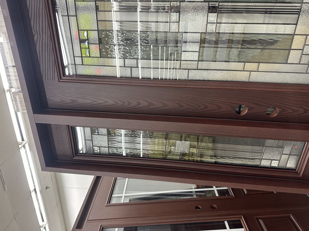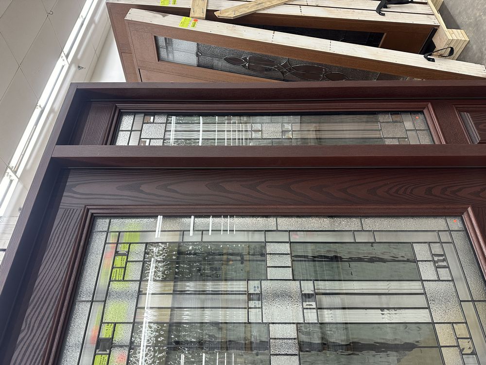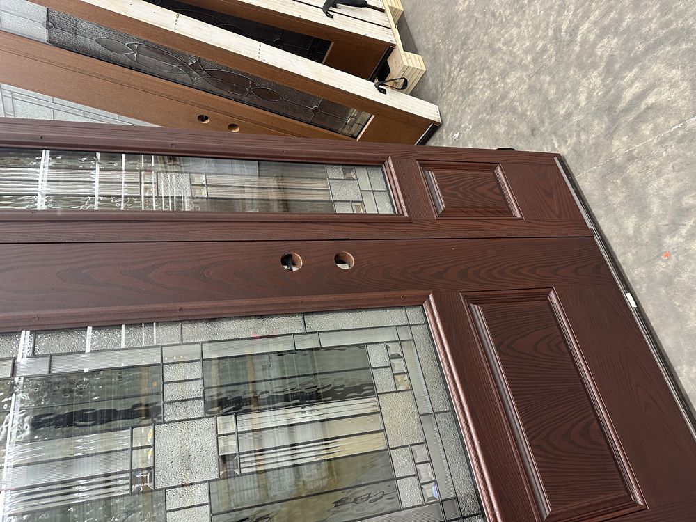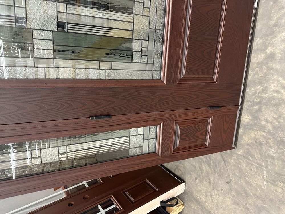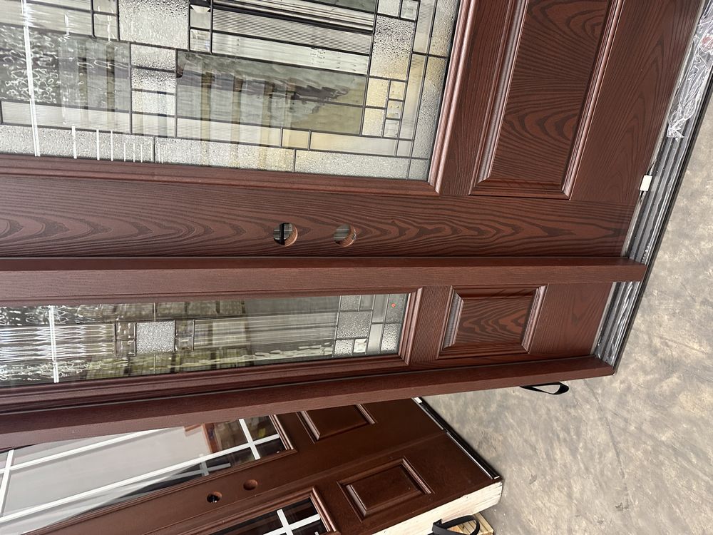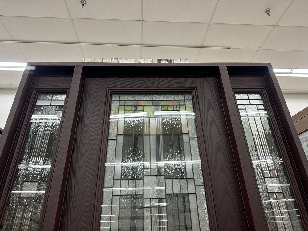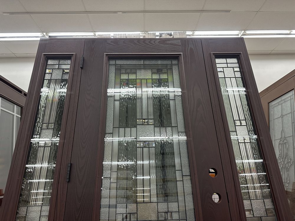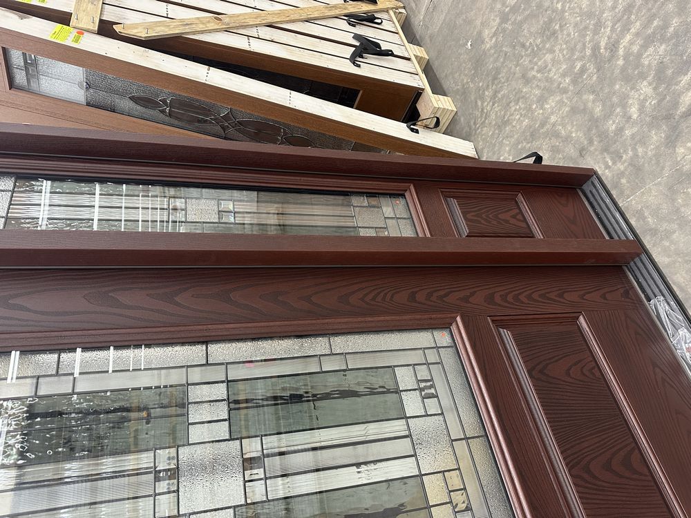 Exterior Fiberglass Deco Door With 2 Side Lites 63 1/2"x81 1/2" RH. Stained Finish, 2-12" Side Lites, 36" Decorative Door, 3/4"x4 1/2" Jambs, 14 1/2"x24 1/2" Glass, Chang'An Pattern, Grade: A. Weight: 180. Sold by: Door. Sold as: Price X Quantity. Inventory #: 5210-EXT FG CH'A STND 1-3-1