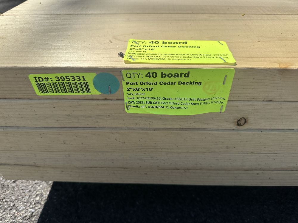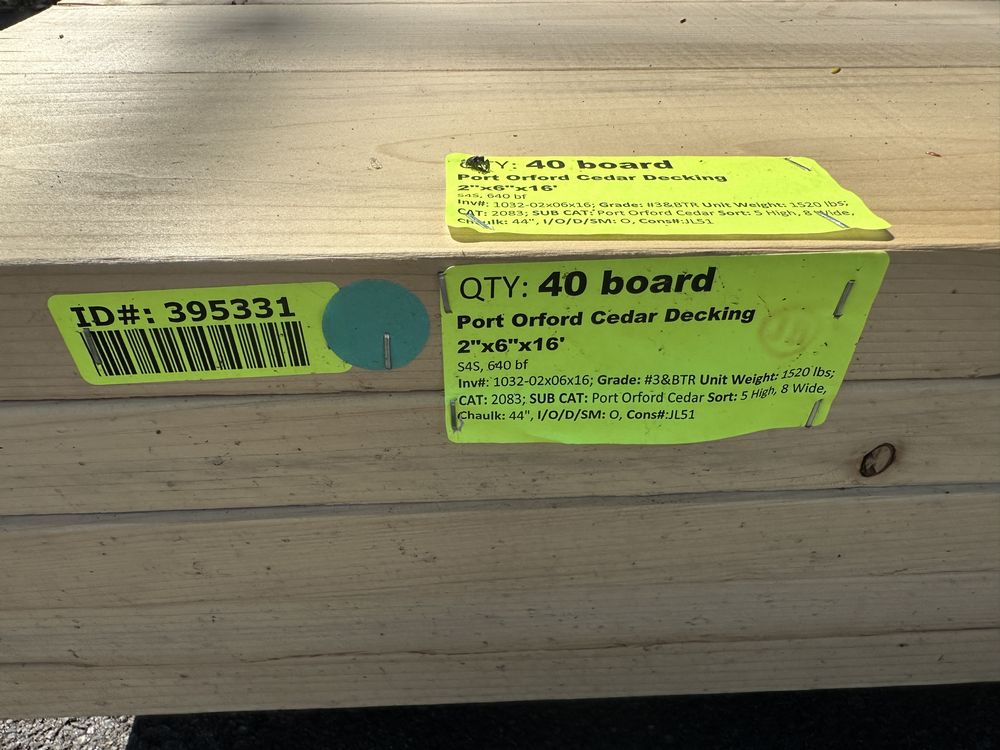 Port Orford Cedar Decking 2"x6"x16'. Benefits & Advantages: Exceptional Strength – One of the hardest and strongest cedars, with great structural integrity. Naturally Decay-Resistant – Contains high levels of essential oils that prevent rot, insects, and mold. Pale, Bright Color – Almost white to light yellow, providing a clean, modern look that ages beautifully. Aromatic – Has a distinct, pleasant fragrance that repels insects and enhances the outdoor experience. Great for High-Traffic Areas – Due to its strength, it’s an excellent choice for decks that see heavy use. Auctioneers Notes: Port Orford Cedar Decking is the ultimate choice for strength, resilience, and natural beauty. With exceptional durability and inherent resistance to rot and insects, this premium decking is perfect for high-moisture environments. Its bright appearance and distinct aromatic properties add a touch of elegance to any outdoor space. A long-lasting investment for homeowners and contractors alike—place your bid today and secure top-tier quality! S4S, 640 Board Foot Grade: #3BTR. Weight: 1520. Sold by: Board. Sold as: Price X Quantity. Inventory #: 1032-02x06x16