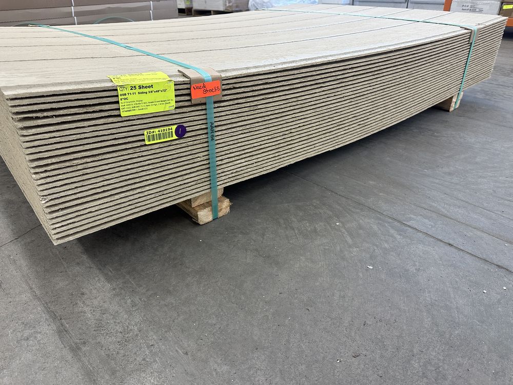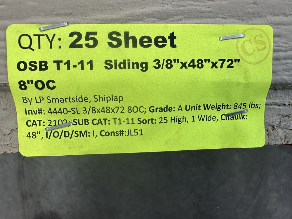 OSB T1-11 Siding 3/8"x48"x72" 8" OC. By LP Smartside, Shiplap, Grade: A. Weight: 845. Sold by: Sheet. Sold as: Price X Quantity. Inventory #: 4440-SL 3/8x48x72 8OC