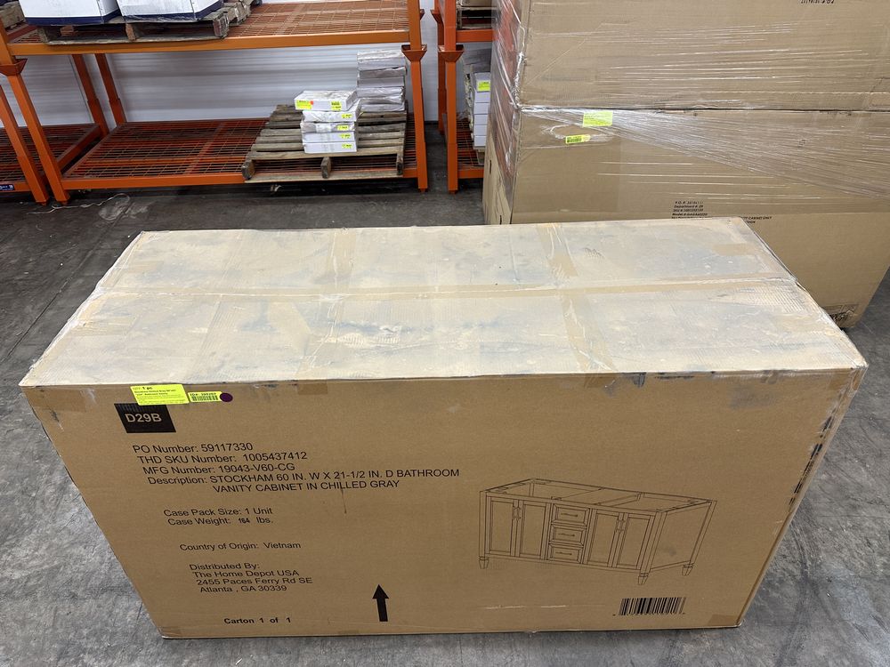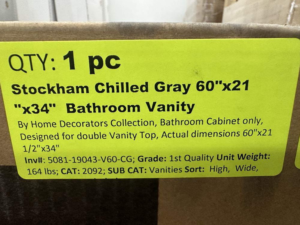Stockham Chilled Gray 60"x21"x34" Bathroom Vanity (NO TOP). By Home Decorators Collection, Bathroom Cabinet Only, Designed For Double Vanity Top, Actual Dimensions 60"x21 1/2"x34", Grade: 1st Quality. Weight: 164. Sold by: Piece. Sold as: Price X Quantity. Inventory #: 5081-19043-V60-CG