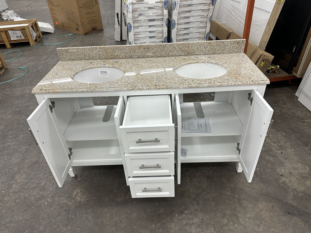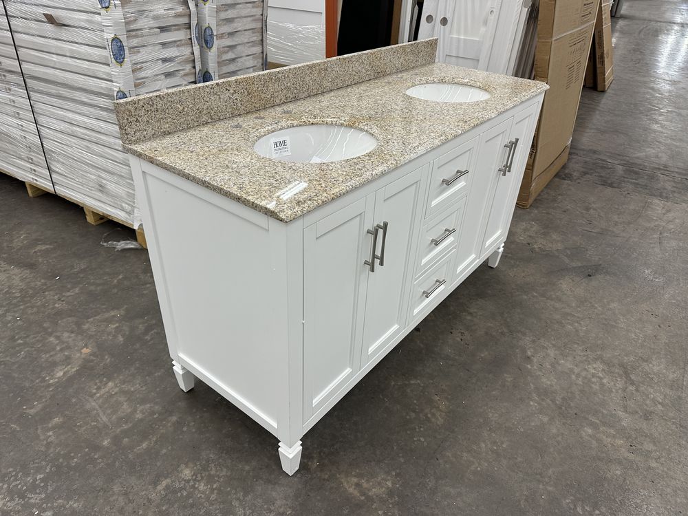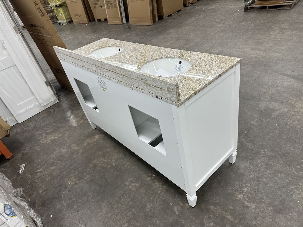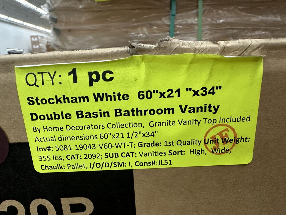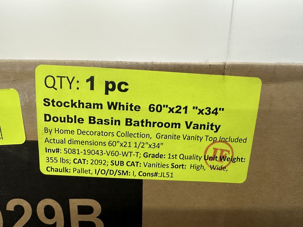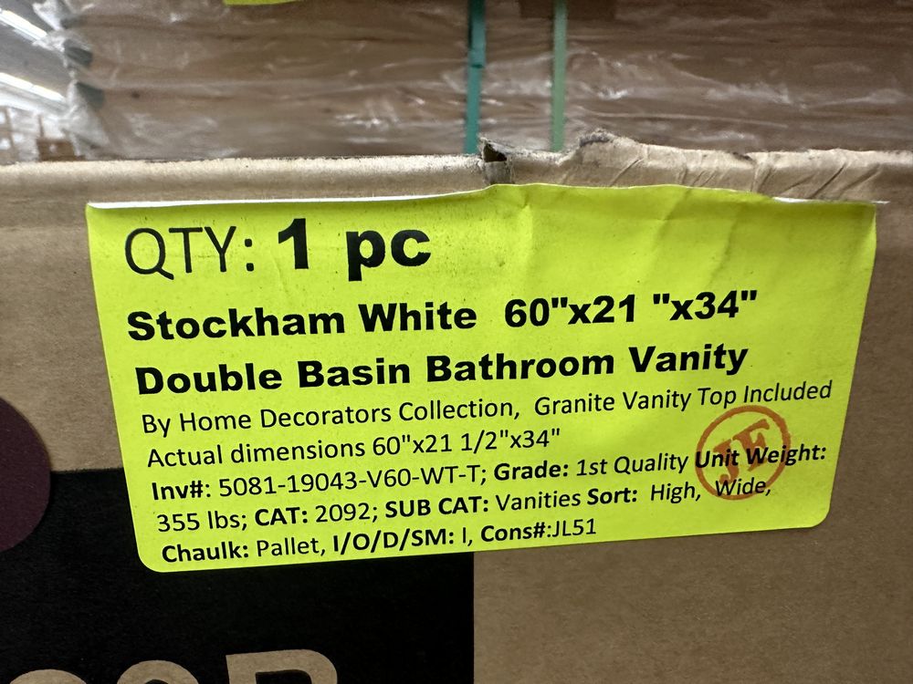 Stockham White 60"x21"x34" Double Basin Bathroom Vanity. By Home Decorators Collection, Granite Vanity Top Included, Actual Dimensions 60"x21 1/2"x34" Grade: 1st Quality. Weight: 355. Sold by: Piece. Sold as: Price X Quantity. Inventory #: 5081-19043-V60-WT-T