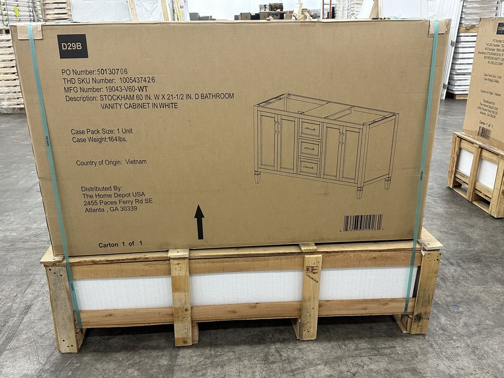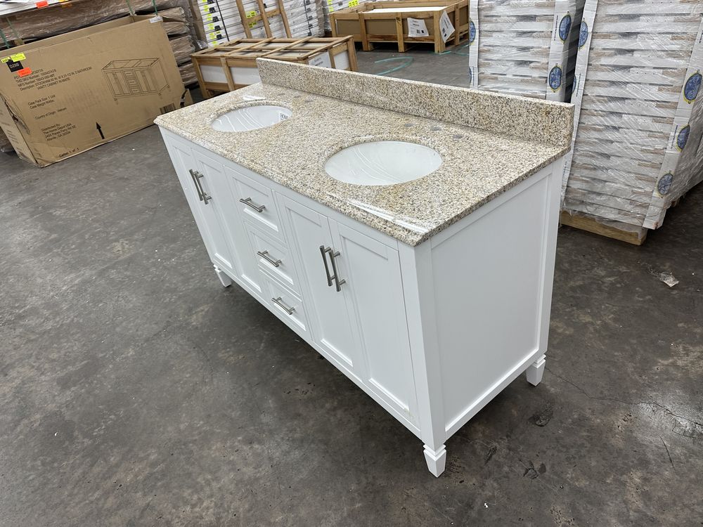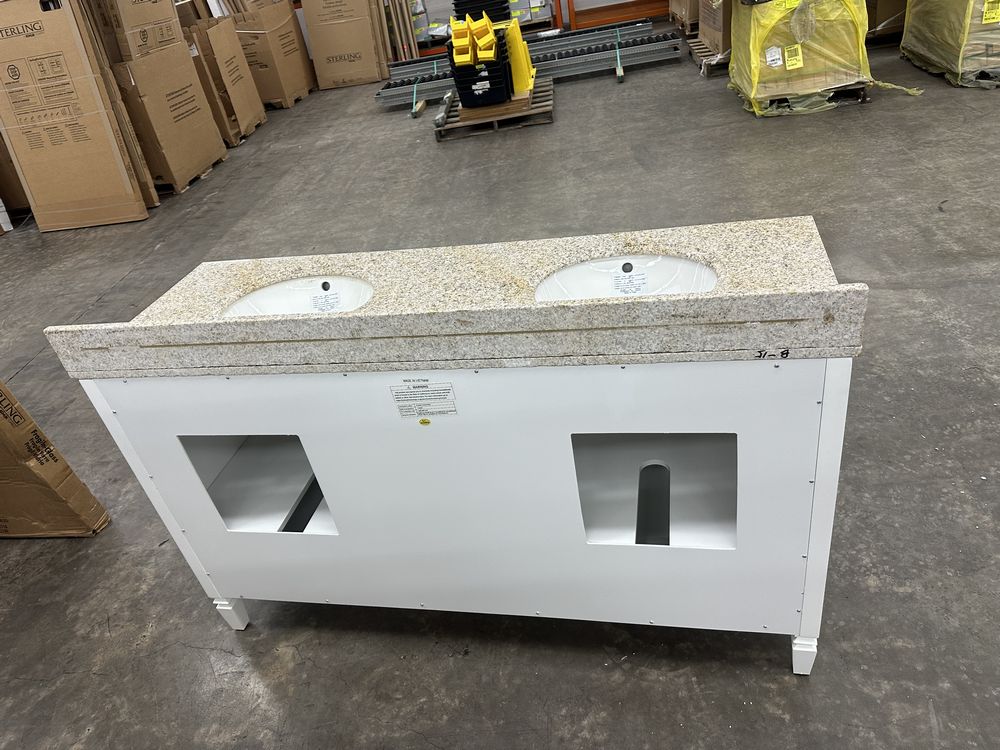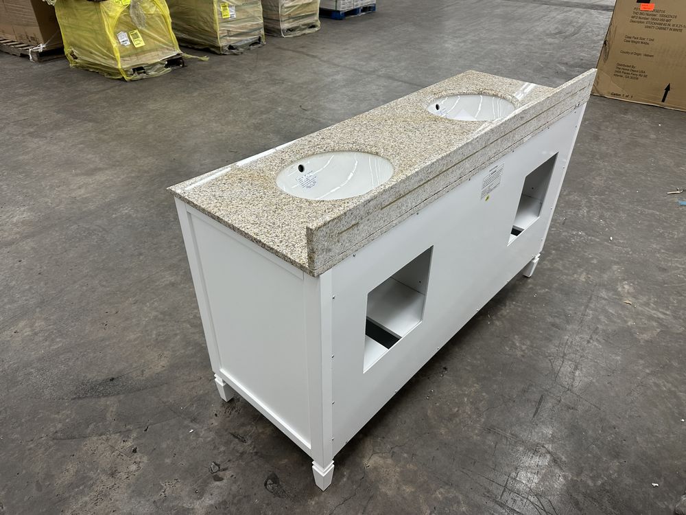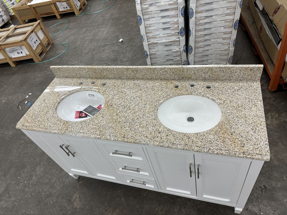Stockham White 60"x21"x34" Double Basin Bathroom Vanity. By Home Decorators Collection, Granite Vanity Top Included, Actual Dimensions 60"x21 1/2"x34" Grade: 1st Quality. Weight: 355. Sold by: Piece. Sold as: Price X Quantity. Inventory #: 5081-19043-V60-WT-T