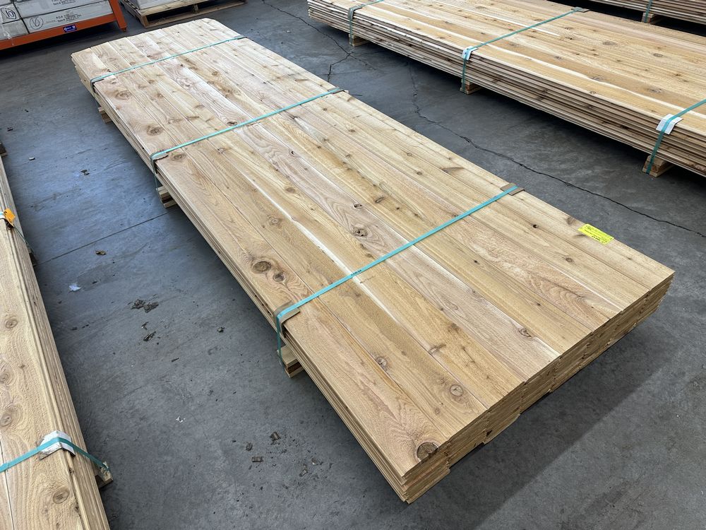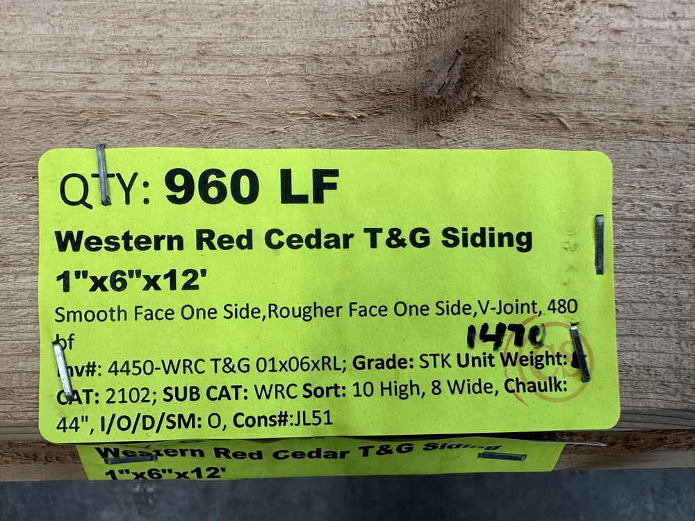 Western Red Cedar T&G Siding 1"x6"x12'. Smooth Face One Side, Rougher Face One Side, V-Joint, 480 Board Foot, Grade: STK. Weight: 1470. Sold by: Linear Foot. Sold as: Price X Quantity. Inventory #: 4450-WRC T&G 01x06xRL