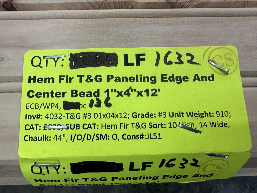 Hem Fir T&G Paneling Edge And Center Bead 1"x4"12'. ECB/WP4, 136 Pieces, Grade: #3. Weight: 910. Sold by: Linear Foot. Sold as: Price X Quantity. Inventory #: 4032-T&G #3 01x04x12