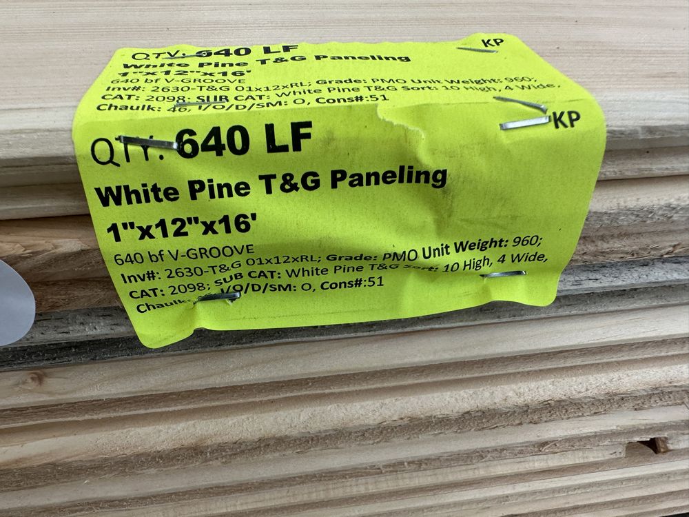 White Pine T&G Paneling 1"x12"x16'. 640 Board Foot, V-Groove, Grade: PMO. Weight: 960. Sold by: Linear Foot. Sold as: Price X Quantity. Inventory #: 2630-T&G 01x12xRL