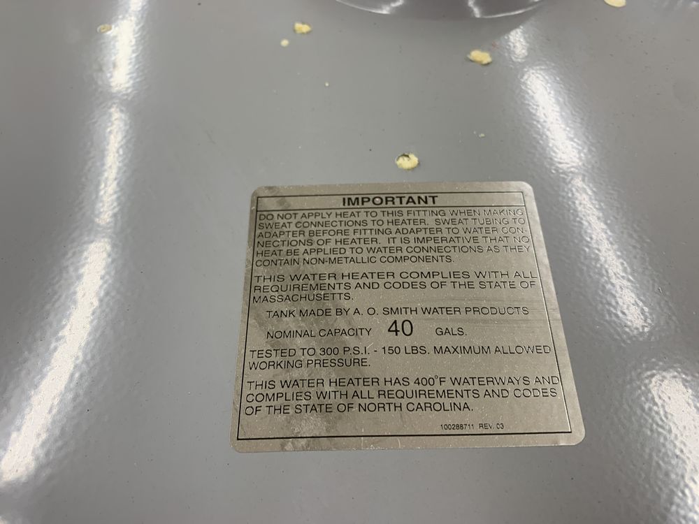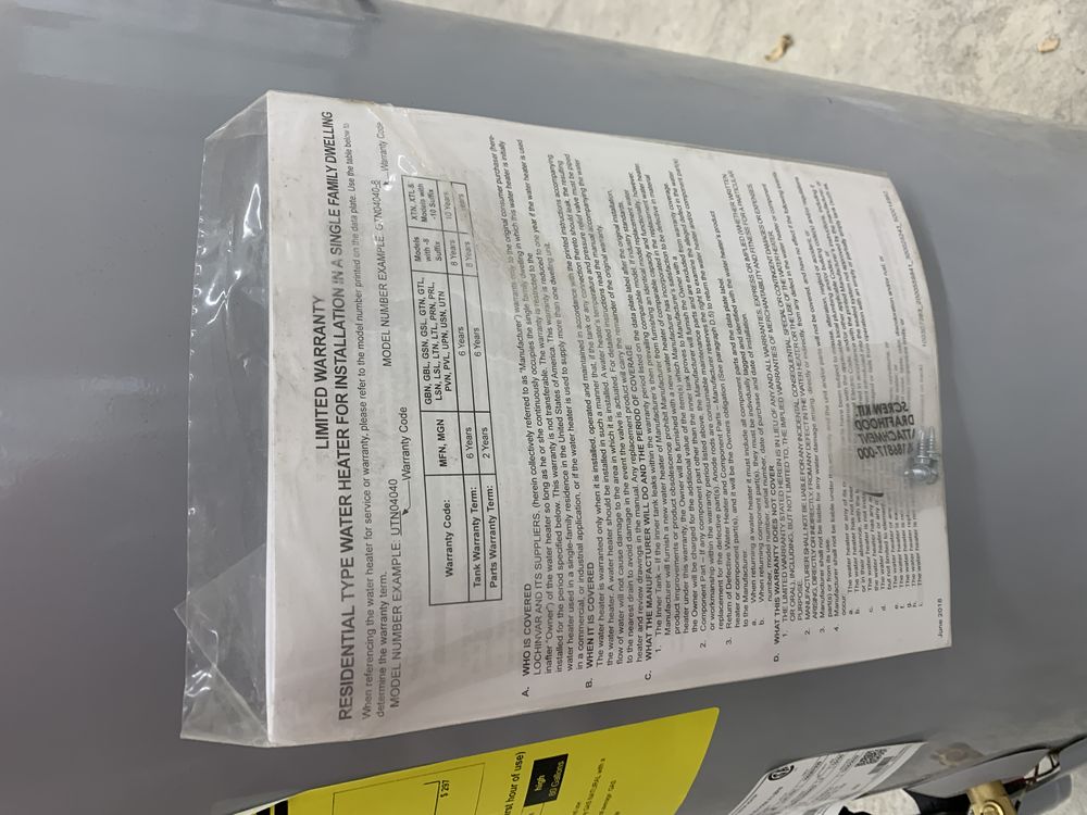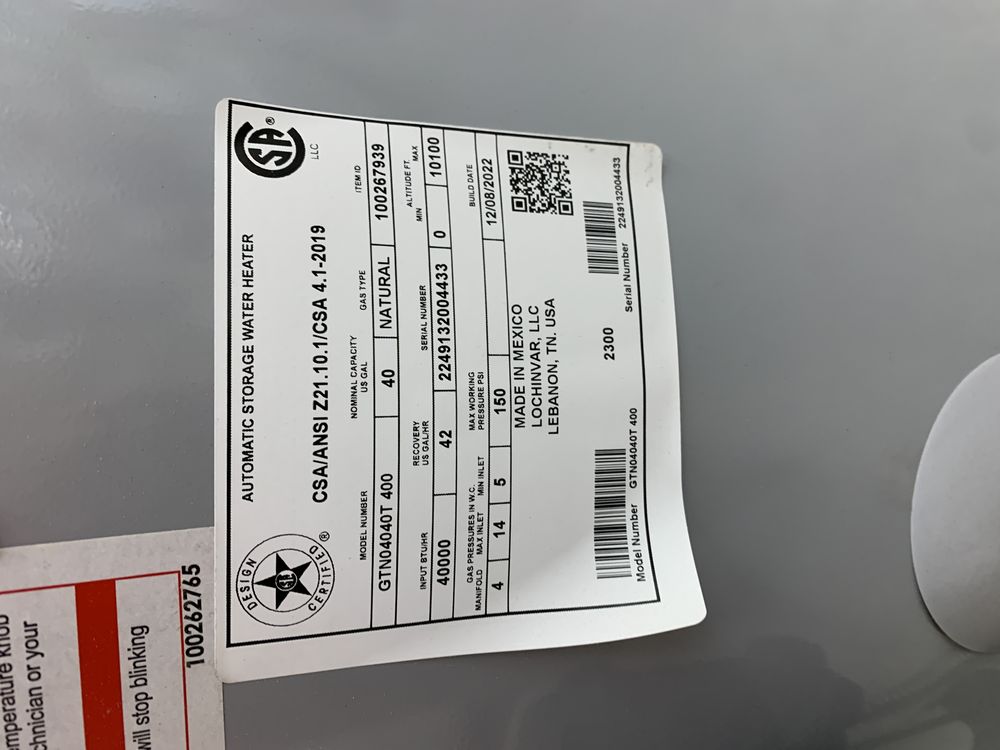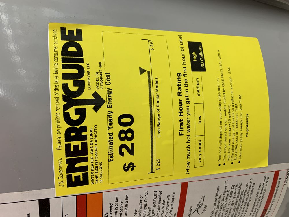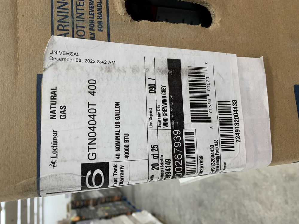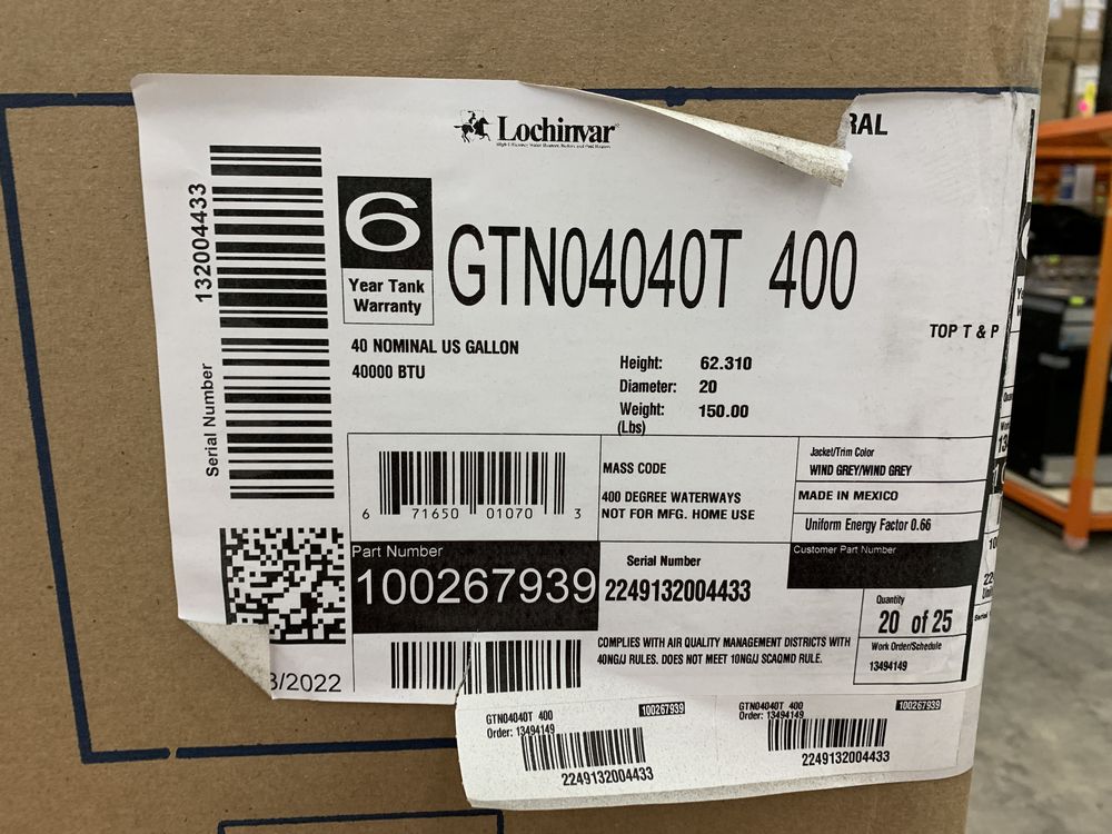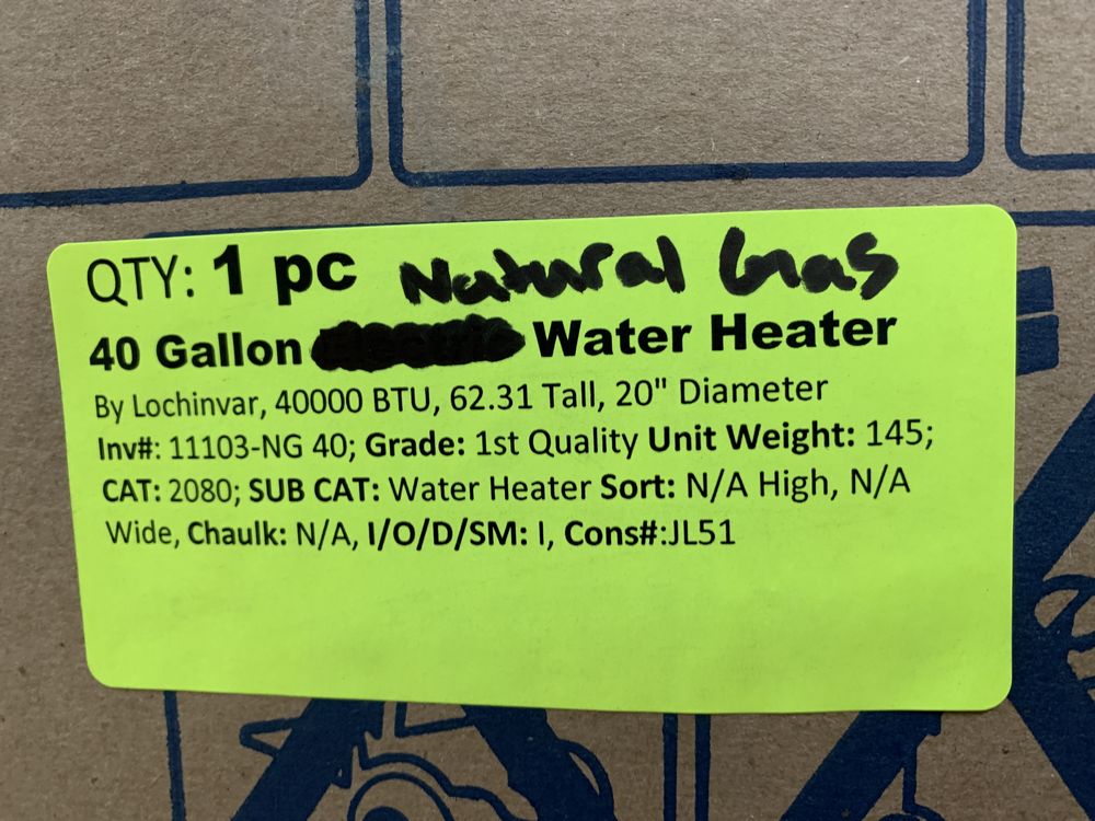 40 Gallon Natural Gas Water Heater. By Lochinvar, 40000 BTU, 62.31" Tall, 20" Diameter, Grade: 1st Quality. Weight: 145. Sold by: Piece. Sold as: Price X Quantity. Inventory #: 11103-NG 40