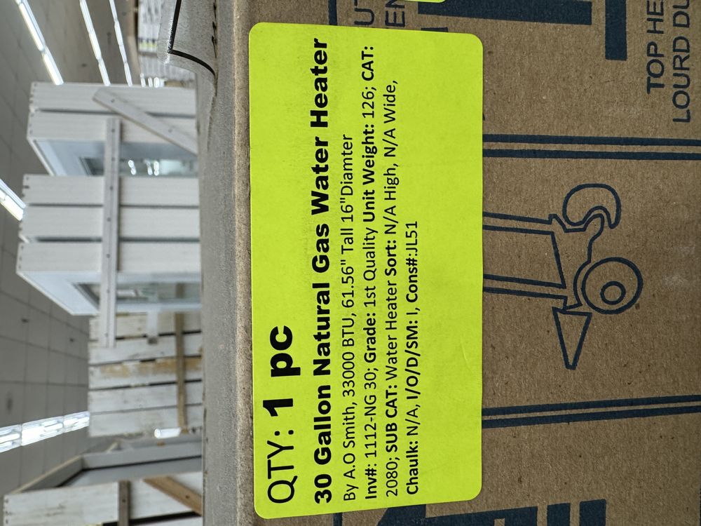 30 Gallon Natural Gas Water Heater. By A.O. Smith, 33000 BTU, 61.56" Tall, 16" Diameter, Grade: 1st. Weight: 126. Sold by: Piece. Sold as: Price X Quantity. Inventory #: 1112-NG 30