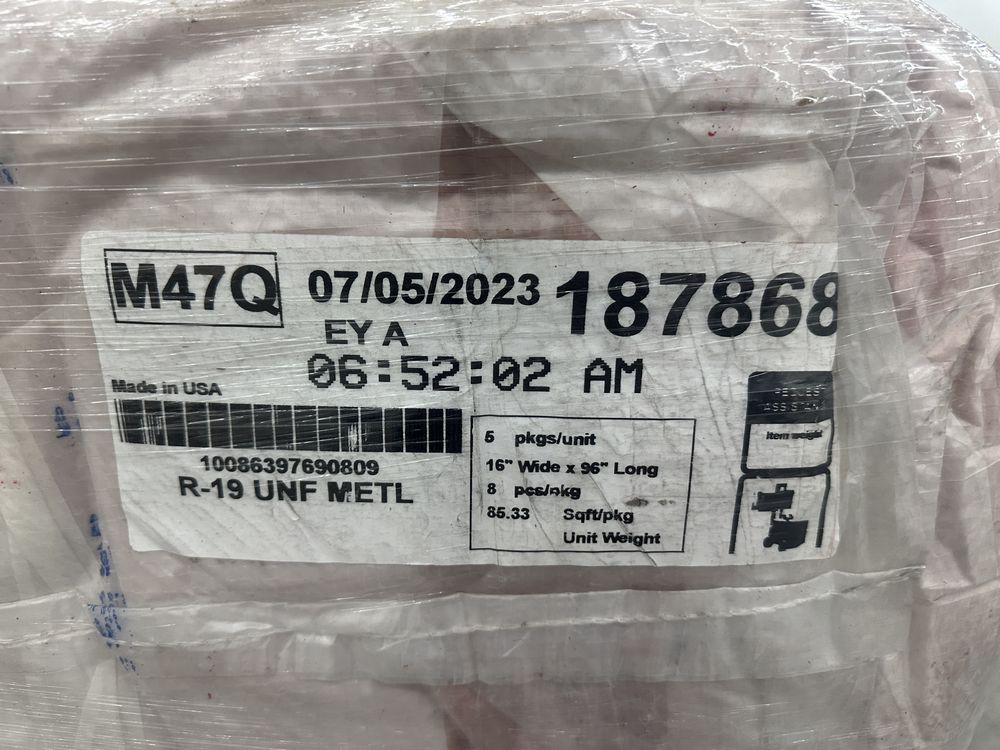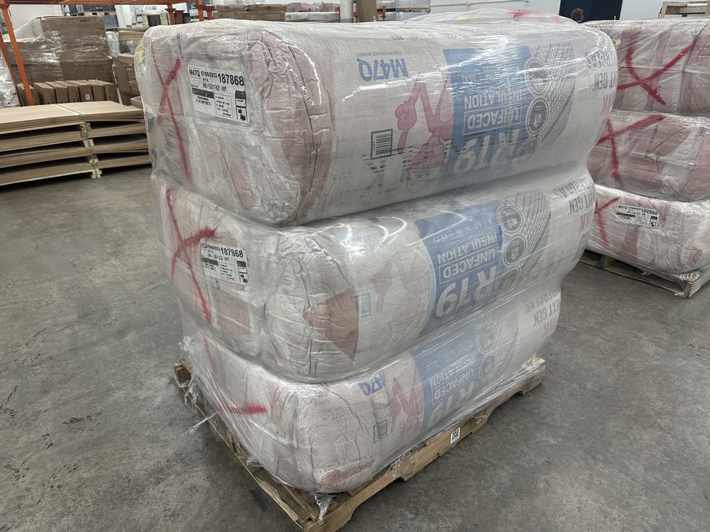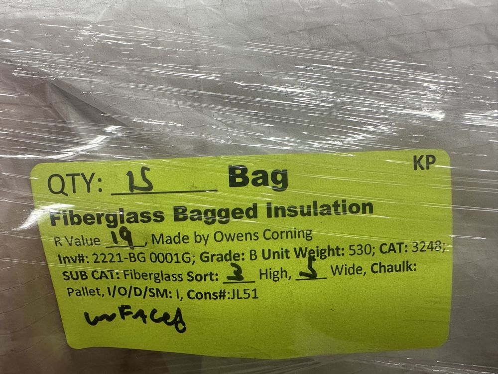 R-19 Unfaced Fiberglass Bagged Insulation. R Value 19, Made By Owen Corning, 5 Pieces 16"x96" 85.33 Square Foot Coverage, Grade: B. Weight: 530. Sold by: Bag. Sold as: Price X Quantity. Inventory #: 2221-BG 0001G