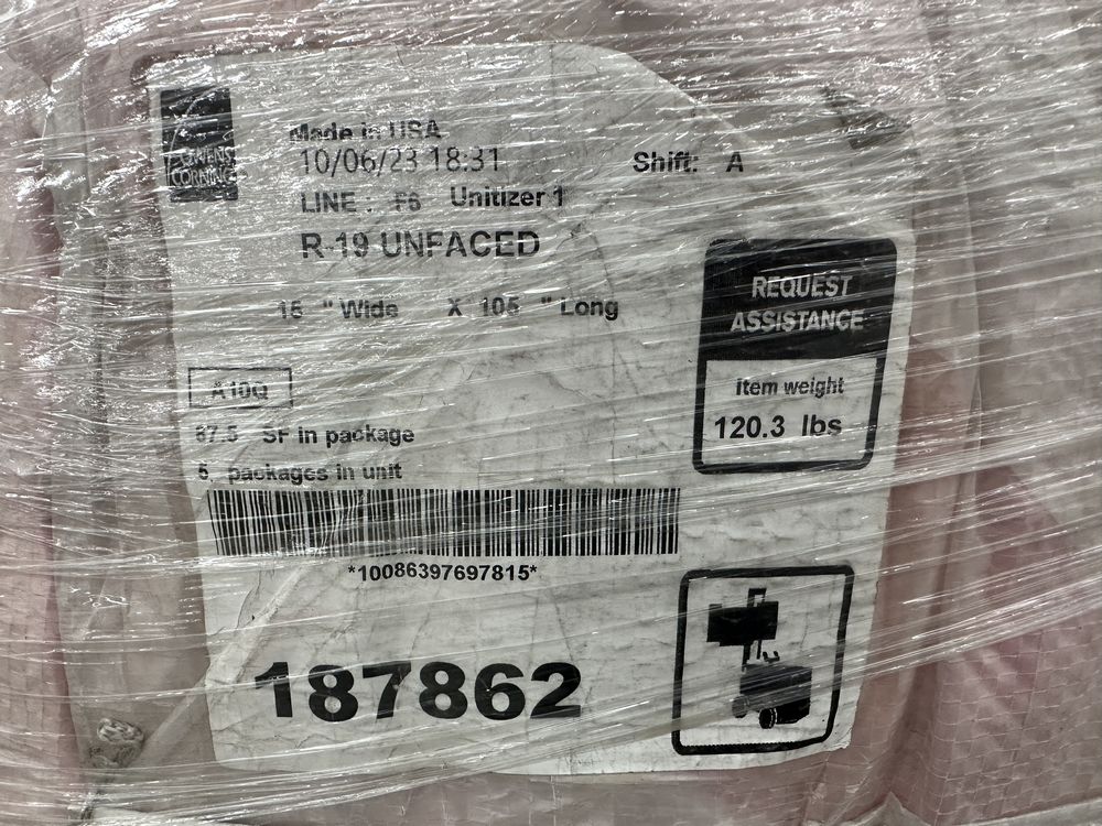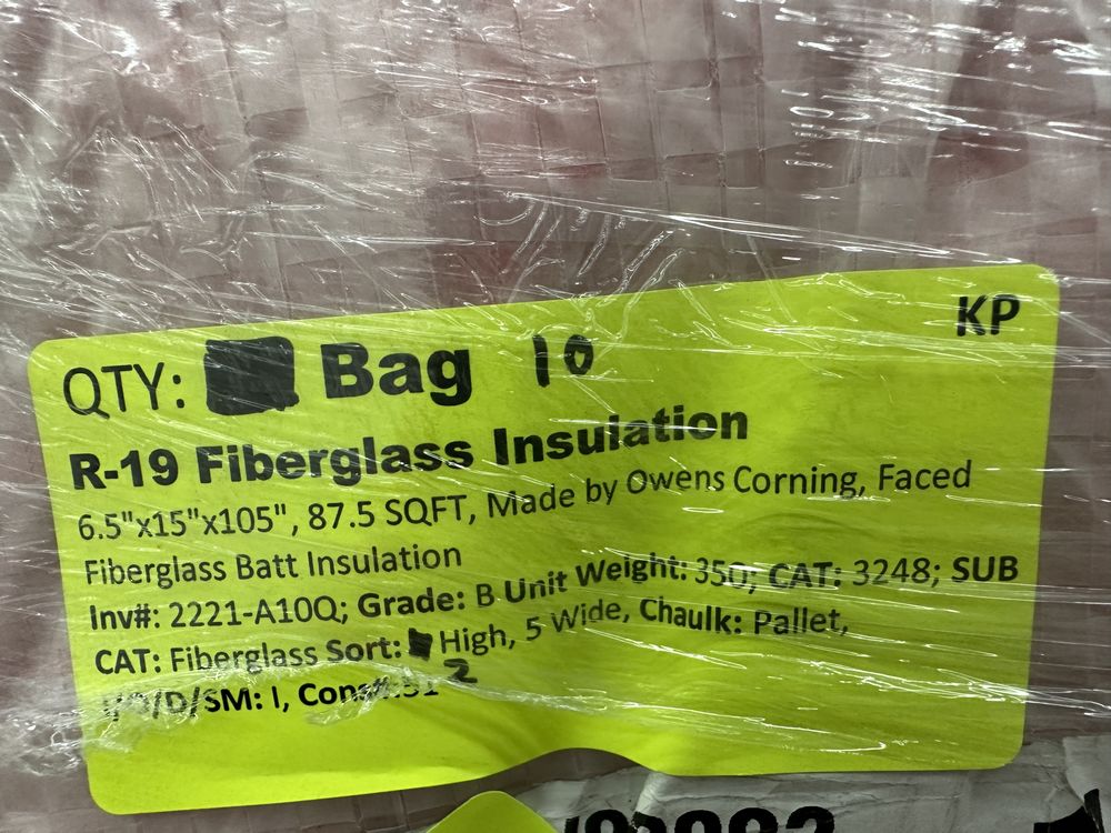 R-19 Unfaced Fiberglass Bagged Insulation. 6.50"x15"x105",87.50 Square Foot,8 Pieces, Made By Owen Corning, Unfaced Fiberglass Batts Insulation, Grade: B. Weight: 350. Sold by: Bag. Sold as: Price X Quantity. Inventory #: 2221-A10Q