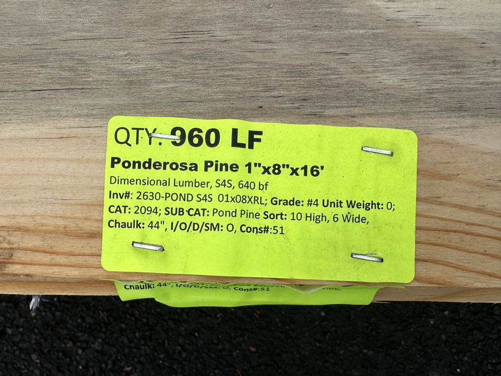 Ponderosa Pine 1"x8"x16'. Dimensional Lumber, S4S, 640 Board Foot, Grade: #4. Weight: x. Sold by: Linear Foot. Sold as: Price X Quantity. Inventory #: 2630-POND S4S 01x08xRL
