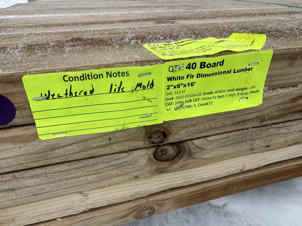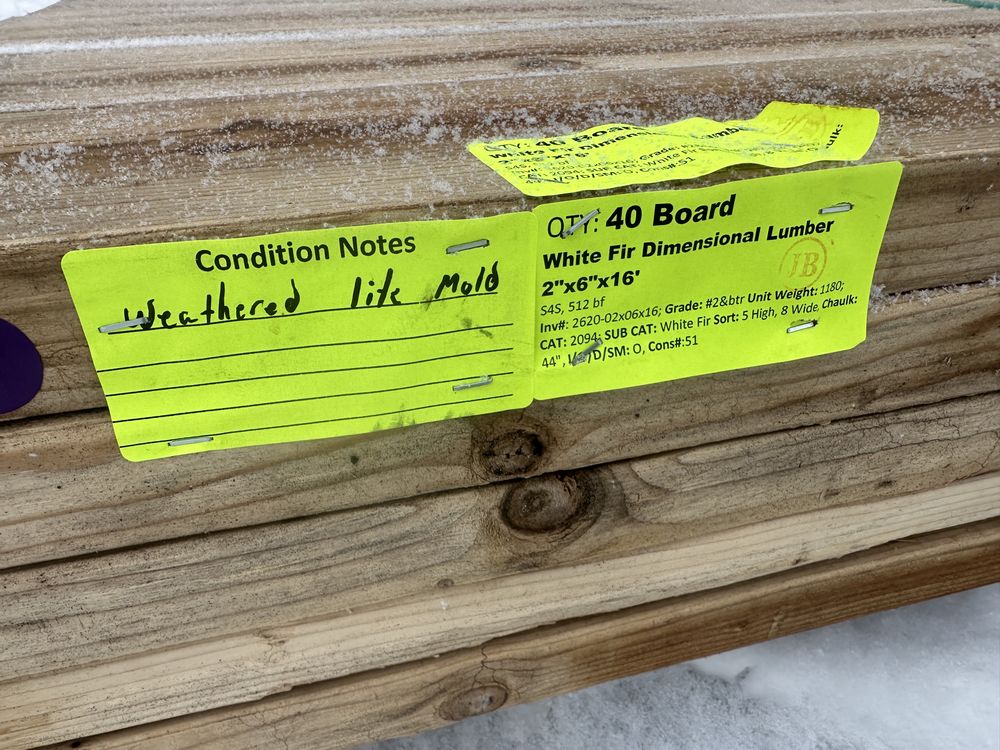 White Fir Dimensional Lumber 2"x6"x16'. S4S, 512 Board Foot, Grade: #2&btr * Weathered, Lite Mold, See Photos*. Weight: 1180. Sold by: Board. Sold as: Price X Quantity. Inventory #: 2620-02x06x16