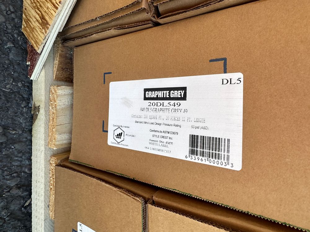 DL-5 Graphite Grey Vinyl Siding 12'. By Style Crest, Manufacturer Warranty Applies, 20 Pieces, 2 Squares per Box, Grade: 1st Quality. Weight: 1480. Sold by: Square. Sold as: Price X Quantity. Inventory #: 44012-DL-5 GG