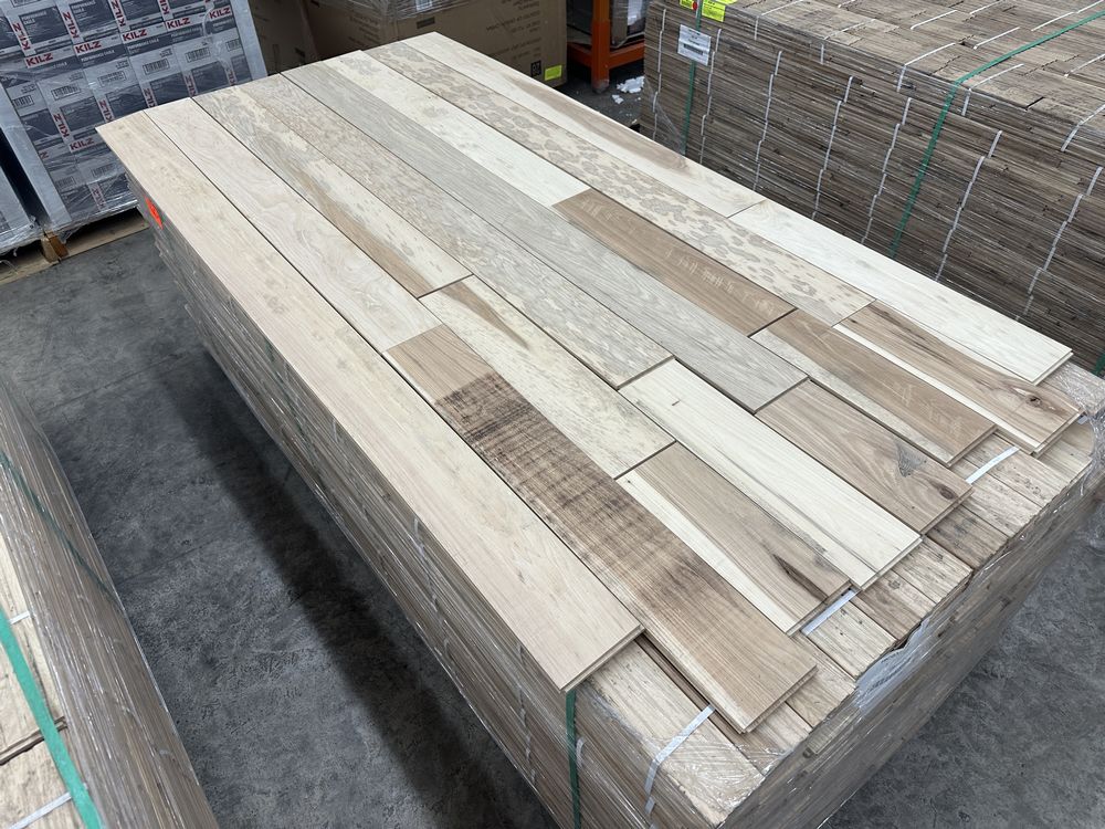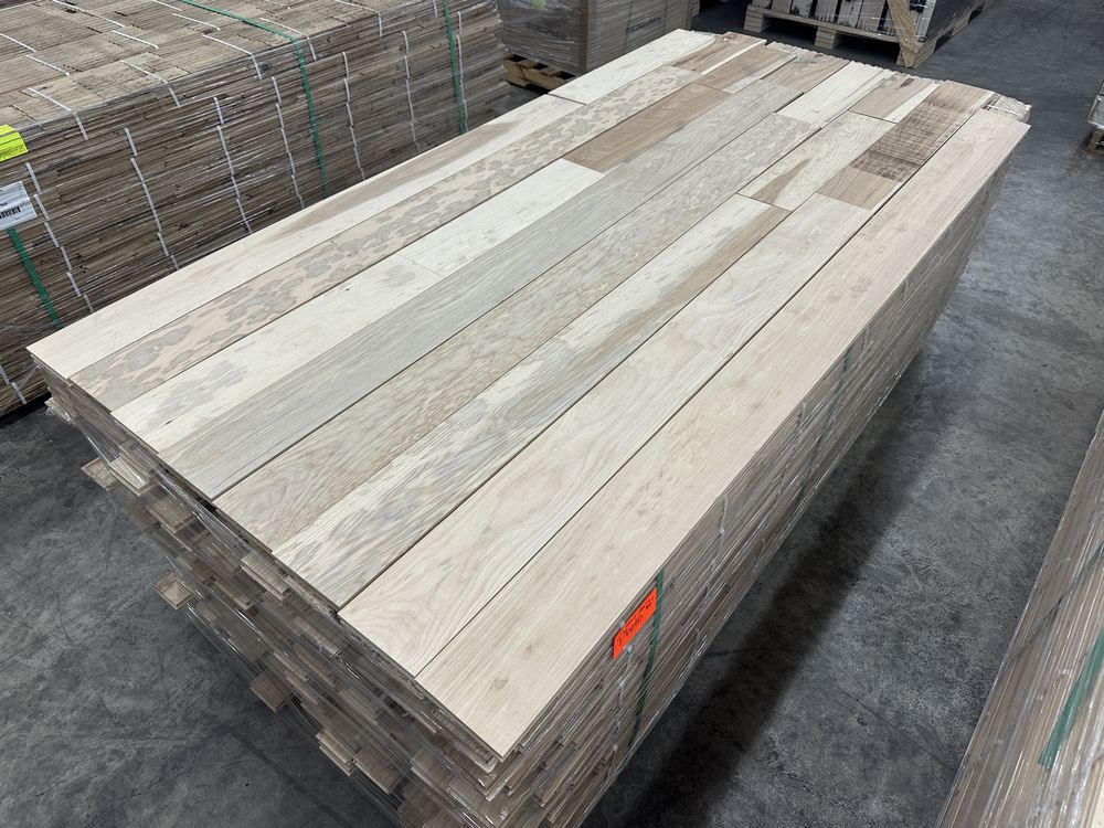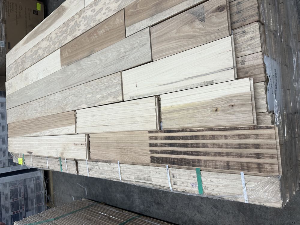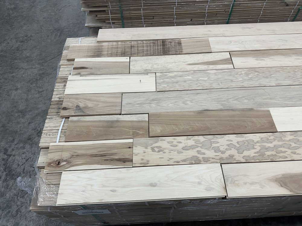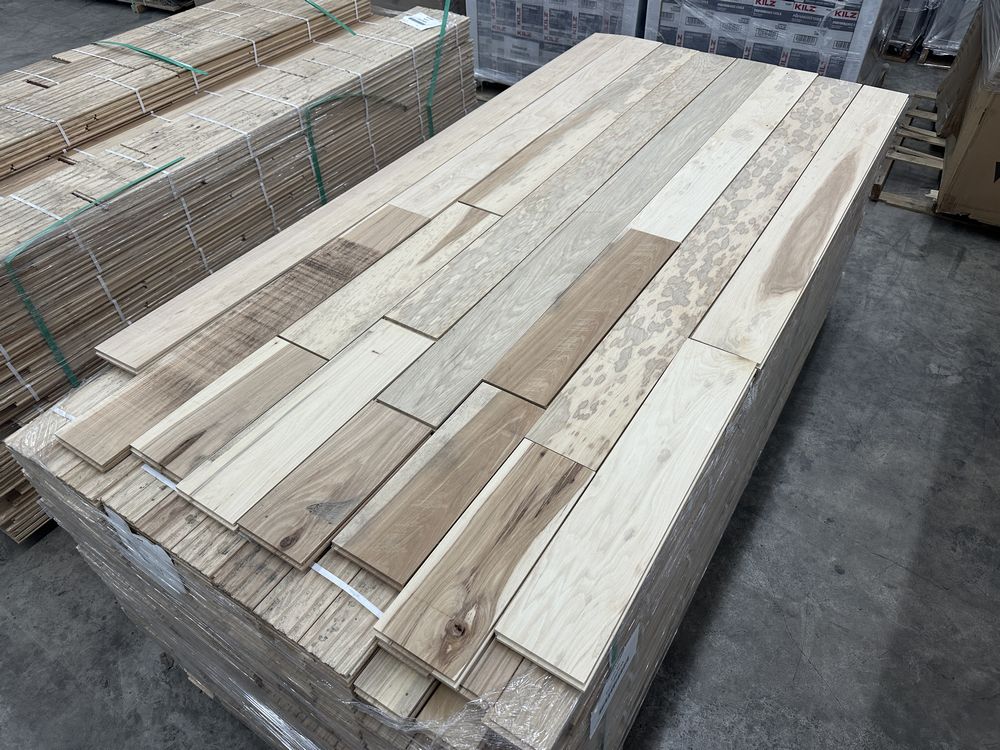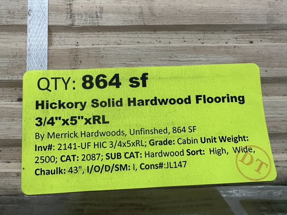 Hickory Solid Hardwood Flooring 3/4"x5"xRL. By Merrick Hardwood, Unfinished, 864 Square Foot, Grade: Cabin. This flooring product will have varying wood characteristics and colors to include streaks, deeper knots and burls, small splits, wormholes, and even marks during the milling process such as machine burns. It may also have a large variance in color and grain patterns. The boards are typically 10” to 30” with an average board length of 16”. It is usually packaged in mini bundles of 18-20 sf per bundle. It is ok for 5” wide to be heavier in shorter pieces. Cabin grade is a stable, installable product but please account up to 10%-20% waste. Weight: 2500. Sold by: Square Foot. Sold as: Price X Quantity. Inventory #: 2141-UF HIC 3/4x5xRL
