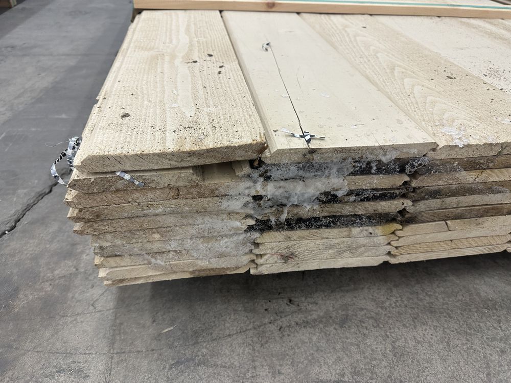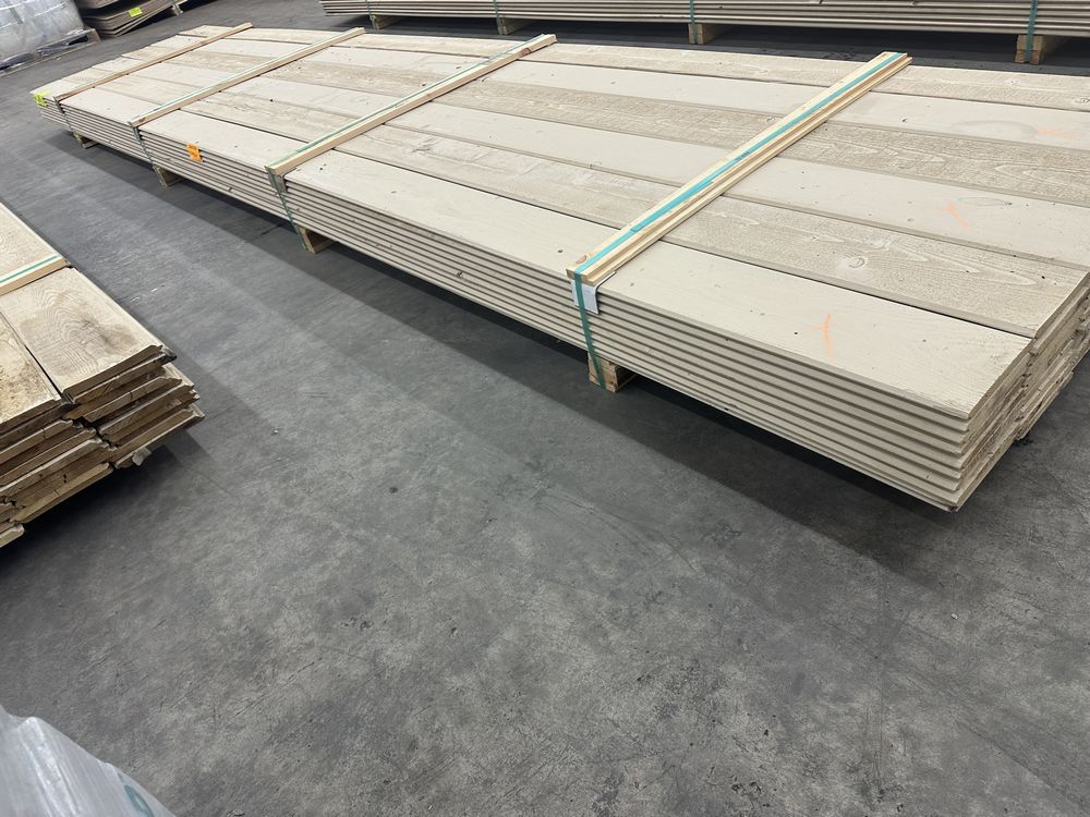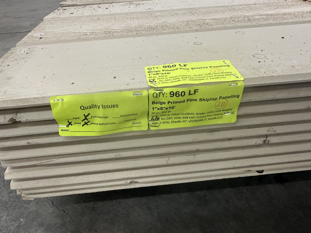 Beige Primed Pine Shiplap Paneling 1"x8"x16'. 60 Pieces, 640 Board Foot, Grade: Utility *Mold, Fork Damage, Heavy Splits/Cracks, Please See Photos*. Weight: 1010. Sold by: Linear Foot. Sold as: Price X Quantity. Inventory #: 2630-SL PRMD 01x08xRL