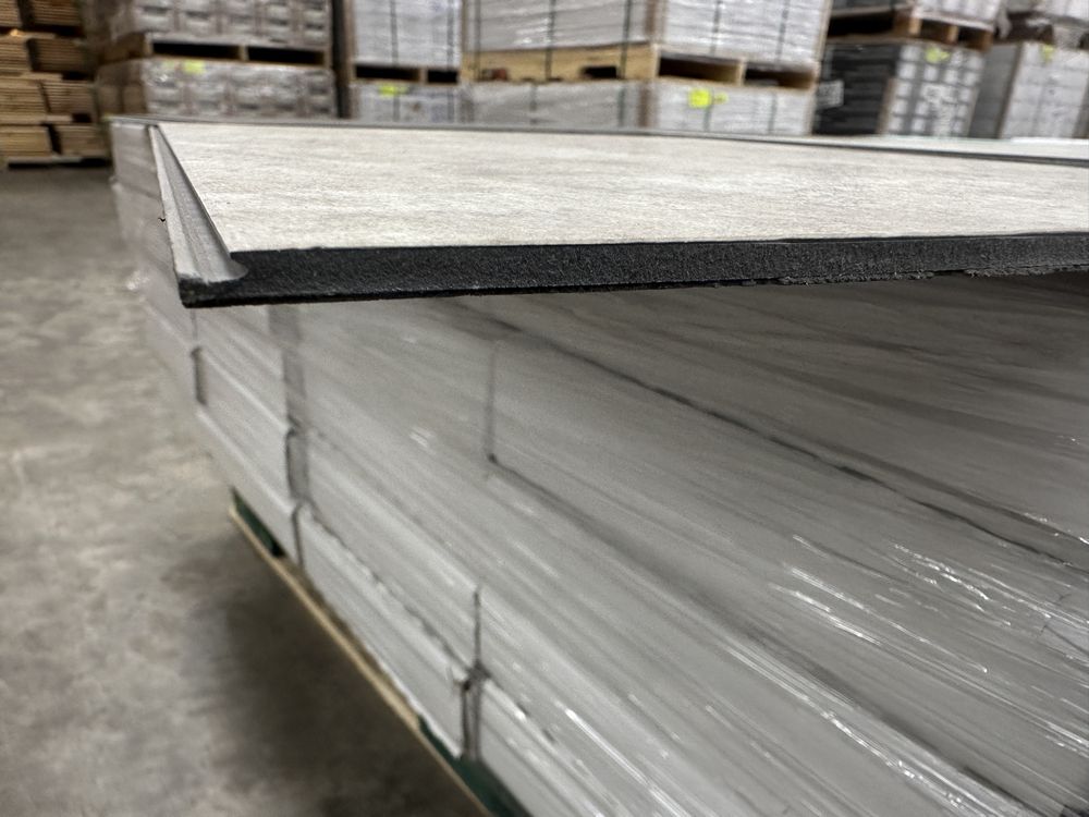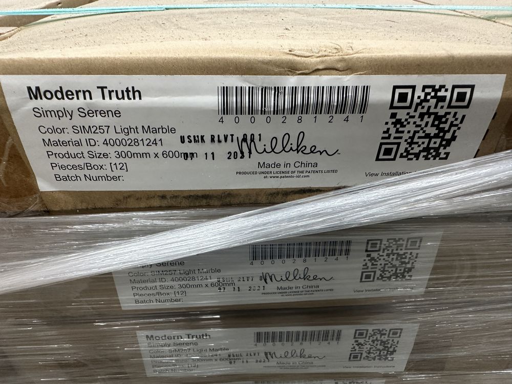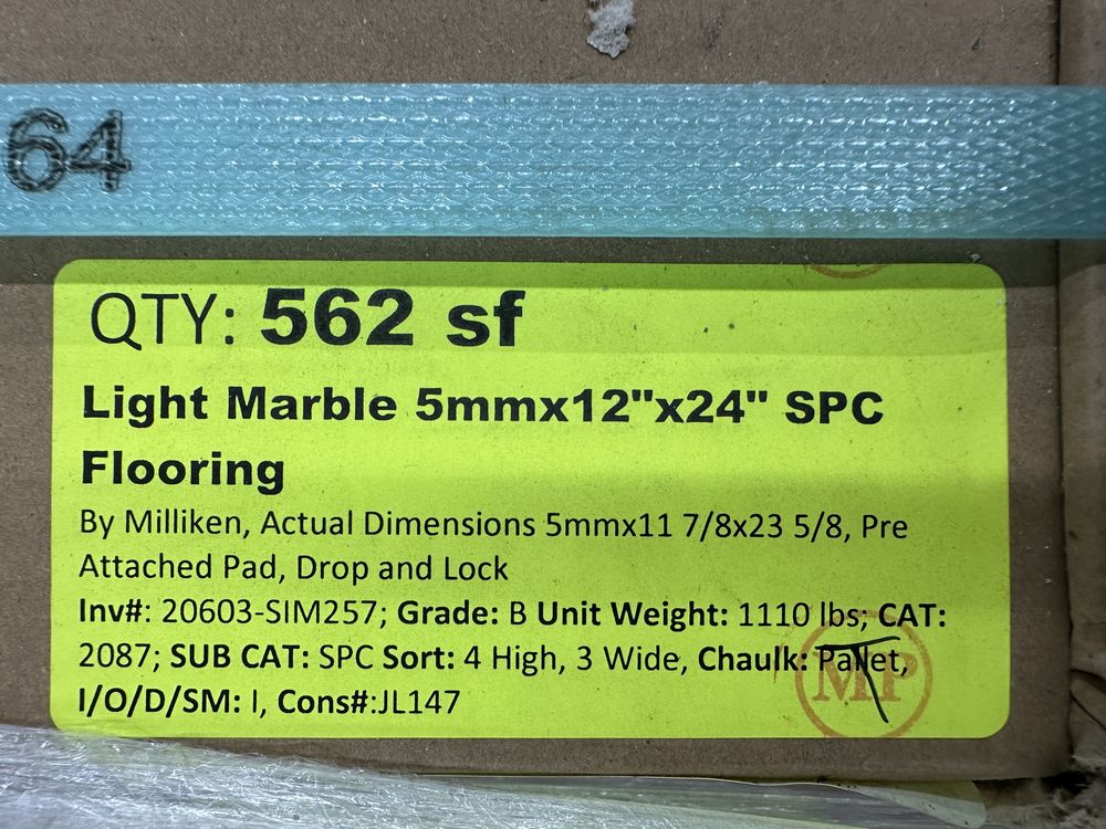 Light Marble 5mmx12"x24" SPC Flooring. By Milliken, Actual Dimensions 5mmx11 7/8x23 5/8, Pre Attached Pad, Drop and Lock, Grade: B 24 boxes, 12 pieces per box. Weight: 1110. Sold by: Square Foot. Sold as: Price X Quantity. Inventory #: 20603-SIM257