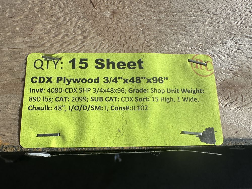 CDX Plywood 3/4"x48"x96". Grade: Shop. Weight: 890. Sold by: Sheet. Sold as: Price X Quantity. Inventory #: 4080-CDX SHP 3/4x48x96