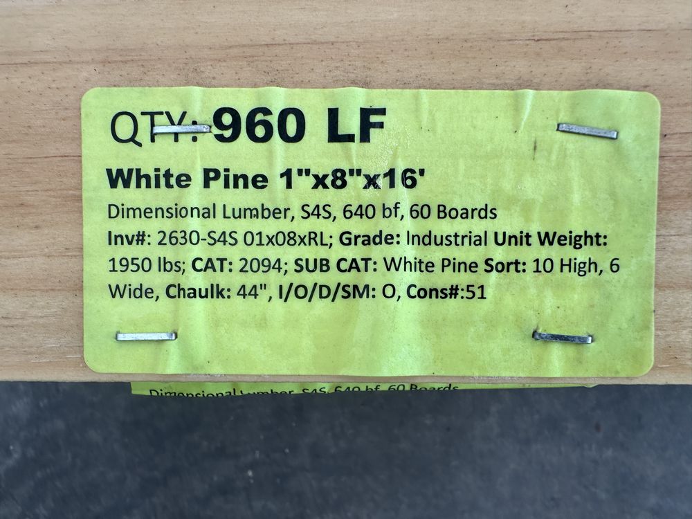 White Pine Dimensional Lumber 1"x8"x16'. Dimensional Lumber, S4S, 640 Board Foot, 60 Boards Total, Grade: Industrial. Weight: 1950. Sold by: Linear Foot. Sold as: Price X Quantity. Inventory #: 2630-S4S 01x08xRL