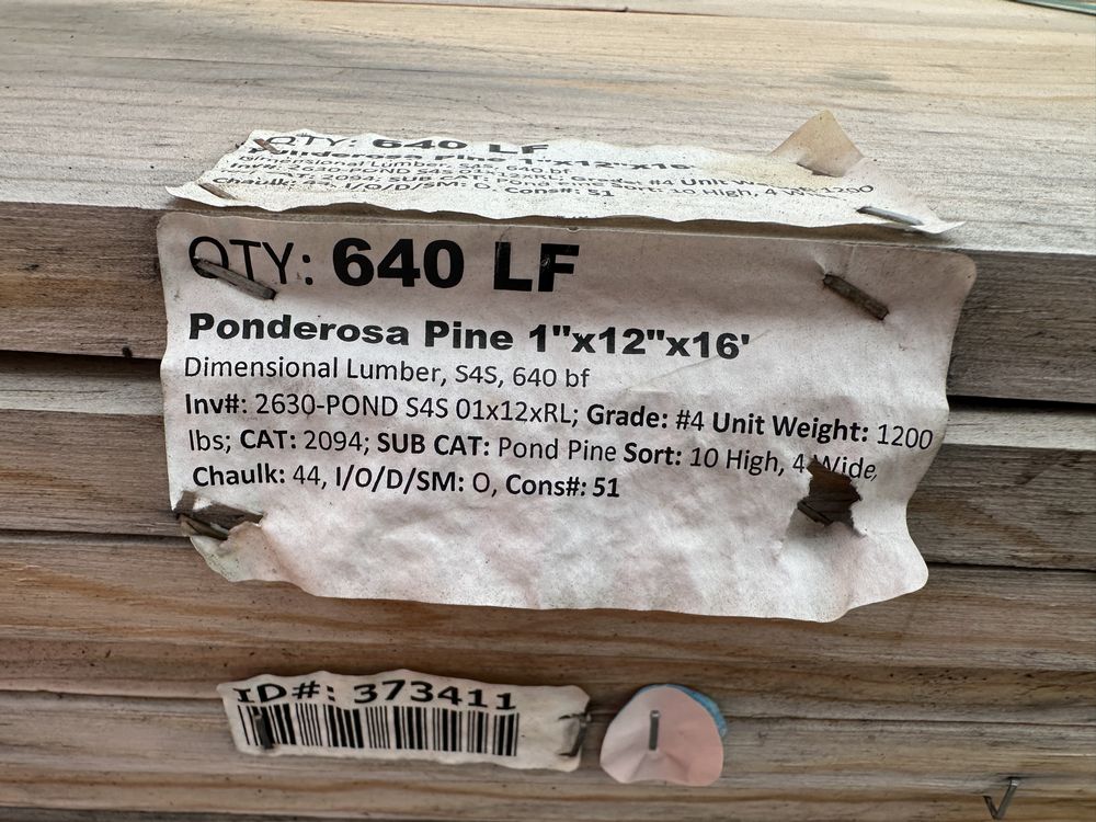 Ponderosa Pine 1"x12"x16'. Dimensional Lumber, S4S, 640 board feet, 40 boards, Grade: #4. Weight: 1200 lbs. Sold by: Linear Foot. Sold as: Price X Quantity. Inventory #: 2630-POND S4S 01x12xRL