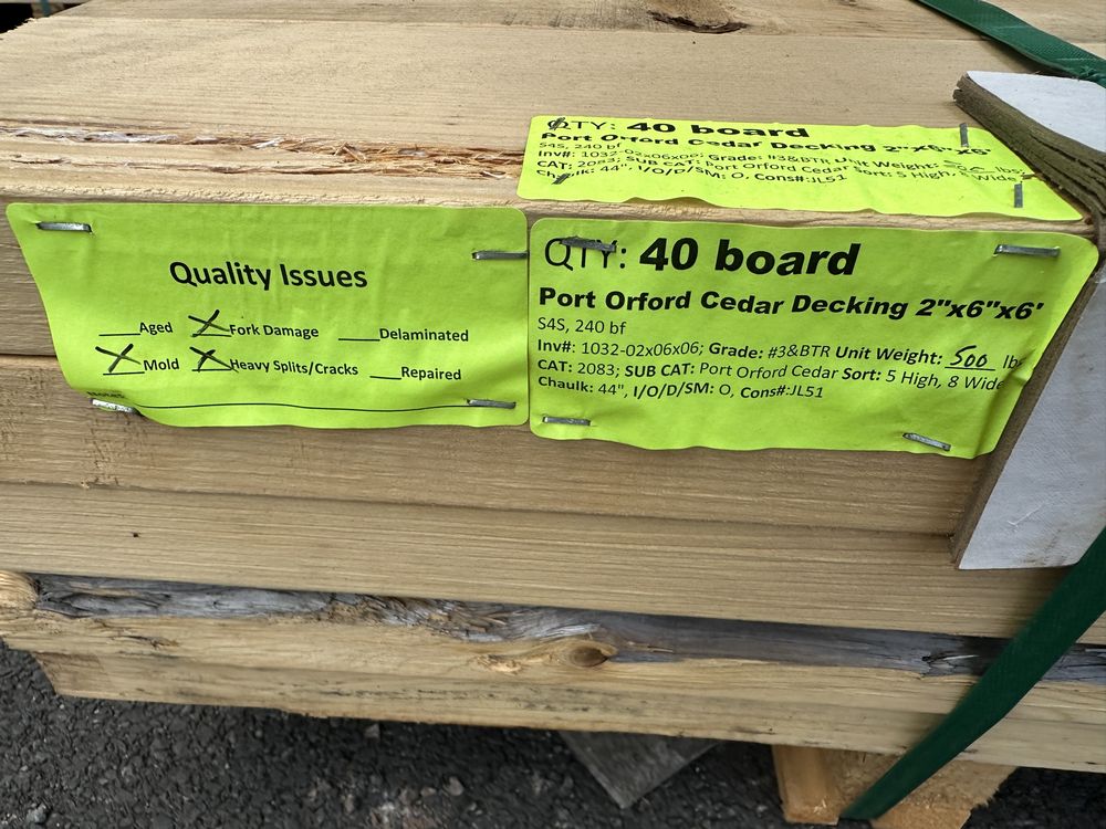 Port Orford Cedar Decking 2"x6"x6' **SEE DESCRIPTION**. Benefits & Advantages: Exceptional Strength – One of the hardest and strongest cedars, with great structural integrity. Naturally Decay-Resistant – Contains high levels of essential oils that prevent rot, insects, and mold. Pale, Bright Color – Almost white to light yellow, providing a clean, modern look that ages beautifully. Aromatic – Has a distinct, pleasant fragrance that repels insects and enhances the outdoor experience. Great for High-Traffic Areas – Due to its strength, it’s an excellent choice for decks that see heavy use. Auctioneers Notes: Port Orford Cedar Decking is the ultimate choice for strength, resilience, and natural beauty. With exceptional durability and inherent resistance to rot and insects, this premium decking is perfect for high-moisture environments. Its bright appearance and distinct aromatic properties add a touch of elegance to any outdoor space. A long-lasting investment for homeowners and contractors alike—place your bid today and secure top-tier quality! S4S, 240 Board Foot, Grade: #3&BTR **Fork Damage, Mold, Heavy Splits/Cracks, SEE PHOTOS**. Weight: 500. Sold by: Board. Sold as: Price X Quantity. Inventory #: 1032-02x06x06