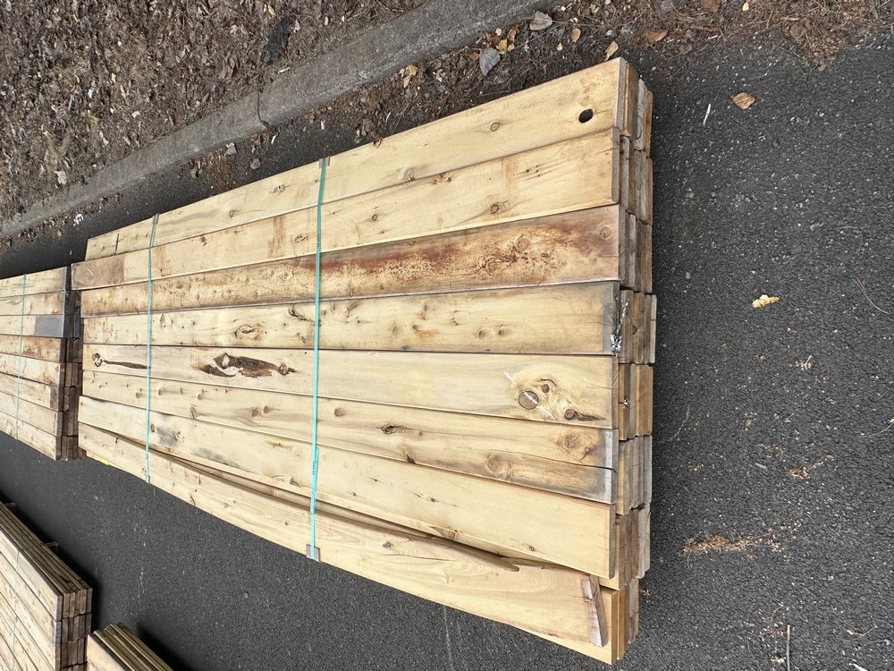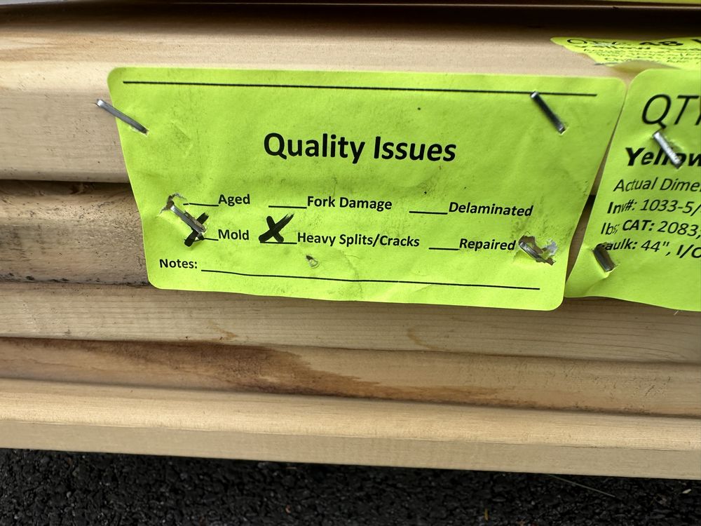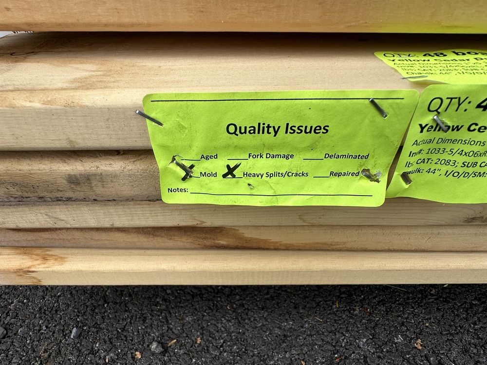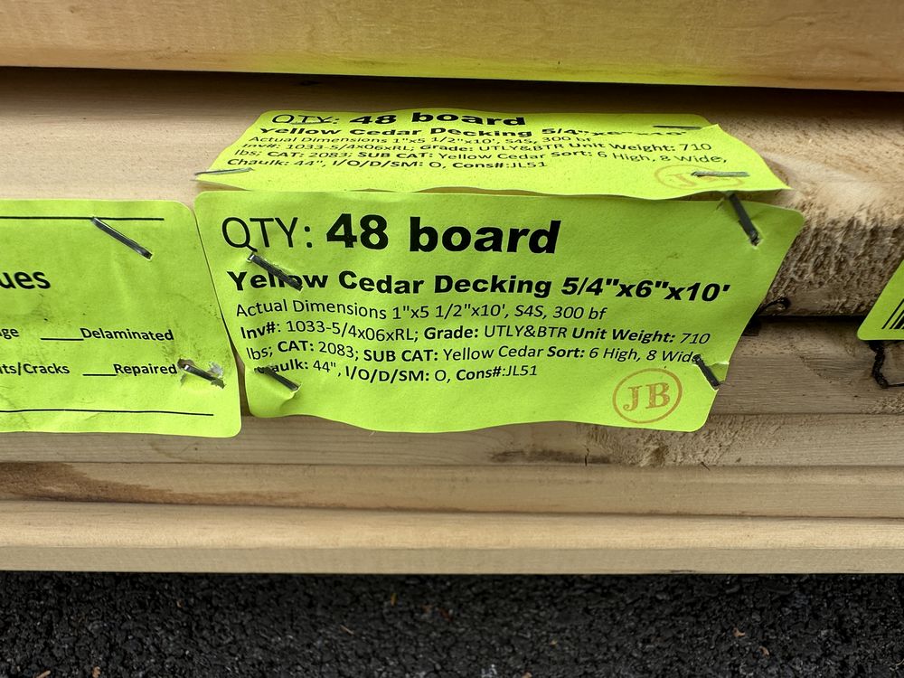 Yellow Cedar Decking 5/4"x6"x10'. Benefits & Advantages: Superior Strength & Density – Highly durable and long-lasting. Natural Rot & Insect Resistance – Contains high levels of natural oils that protect against decay. Distinct Yellow Hue – Starts as a bright yellow-gold color, which weathers to a beautiful silver-gray over time. Highly Workable – Cuts and machines well with minimal splintering, making it a great choice for custom decks. Low Maintenance – Can be left untreated for a naturally weathered look or sealed to maintain its golden hue. Auctioneers Notes: Yellow Cedar Decking offers an exceptional combination of strength, beauty, and longevity. With its stunning golden hue and natural resistance to moisture, it’s the ideal choice for coastal, humid, or high-exposure environments. This durable wood weathers beautifully over time, adding a touch of luxury to any outdoor space. Whether you're building a high-end deck or a long-lasting outdoor structure, this premium material delivers. Bid now to secure top-tier quality! Actual Dimensions 1"x5 1/2"x10', S4S, Grade: UTLY&BTR **Mold, Heavy Splits/Cracks, SEE PHOTOS**. Weight: 710. Sold by: Board. Sold as: Price X Quantity. Inventory #: 1033-5/4x06xRL