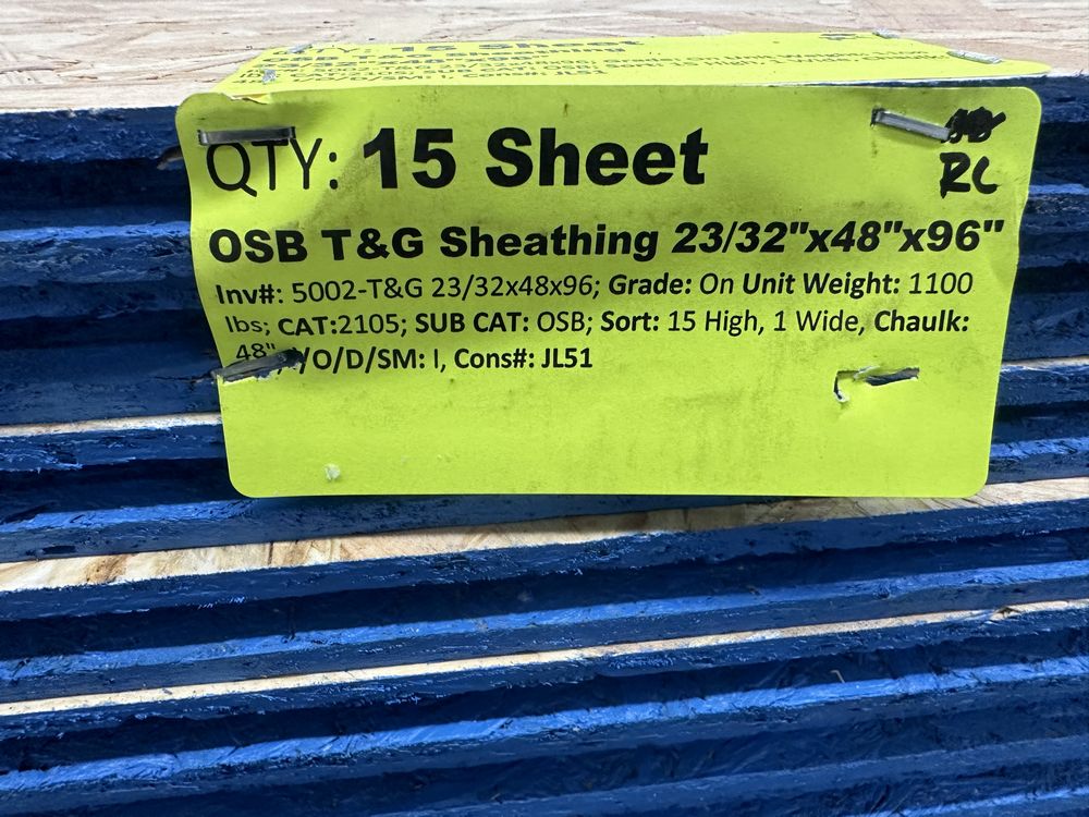 OSB T&G Sheathing 23/32"x48"x96". Grade: On *The photos presented are an illustration of a standard pack of OSB T&G Sheathing 23/32"x48"x96"*. Weight: 1100. Sold by: Sheet. Sold as: Price X Quantity. Inventory #: 5002-T&G 23/32x48x96