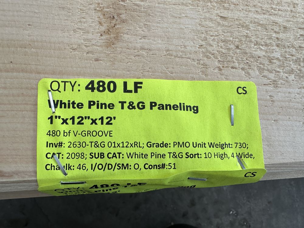 White Pine T&G Paneling 1"x12"x12'. 480 Board Foot, V-Groove, Grade: PMO. Weight: 730. Sold by: Linear Foot. Sold as: Price X Quantity. Inventory #: 2630-T&G 01x12xRL