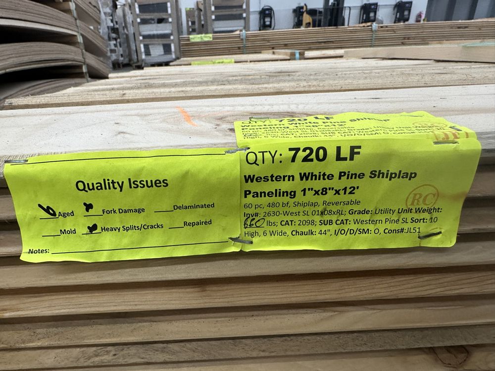 Western White Pine Shiplap Paneling 1"x8"x12'. 60 Pieces, 480 Board Foot, Reversable Grade: Utility *Aged, Fork Damage, Heavy Splits/Cracks, See Photos*. Weight: 660. Sold by: Linear Foot. Sold as: Price X Quantity. Inventory #: 2630-West SL 01x08xRL