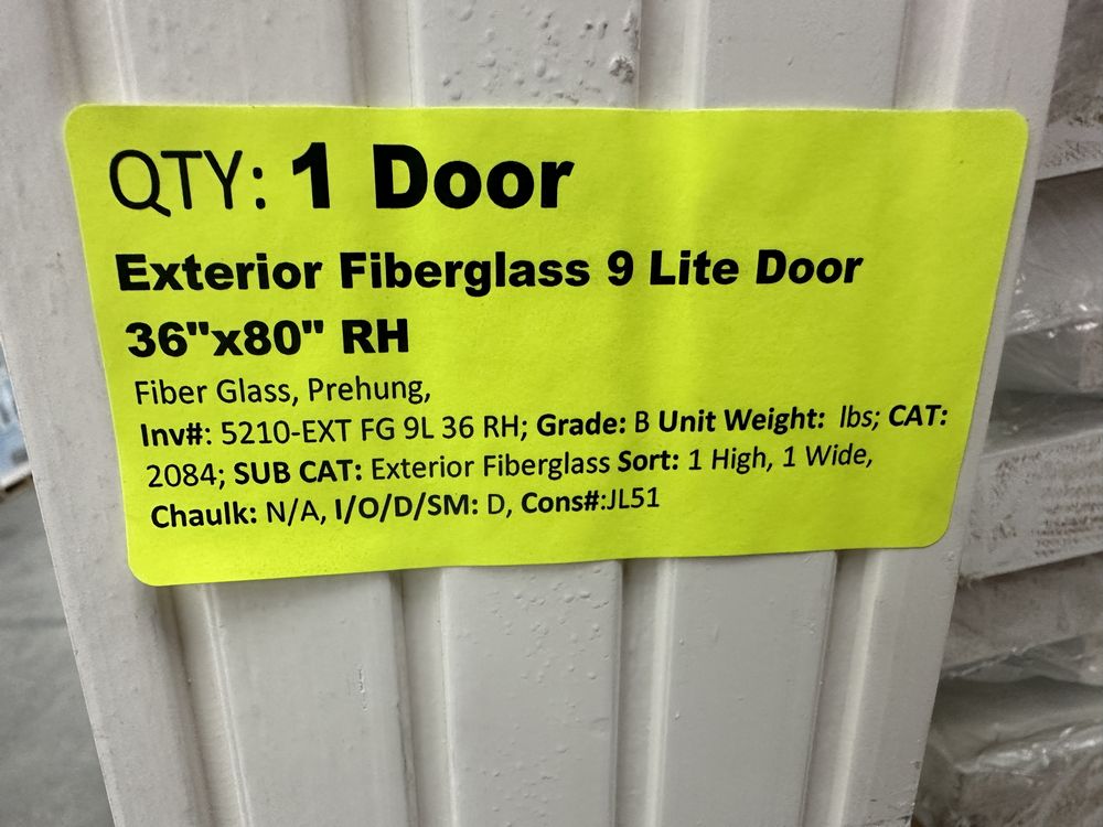 Exterior Fiberglass 9 Lite Door 36"x80" RH. Fiberglass Pre-Hung, Grade: B. Weight: x. Sold by: Door. Sold as: Price X Quantity. Inventory #: 5210-EXT FG 9L 36 RH