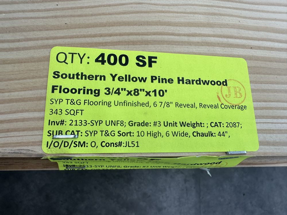 Southern Yellow Pine Hardwood Flooring 3/4"x8"x10'. SYP T&G Flooring Unfinished, 6 7/8" Reveal, Reveal Coverage 343 Square Foot, Grade: #3. Weight: x. Sold by: Square Foot. Sold as: Price X Quantity. Inventory #: 2133-SYP UNF8