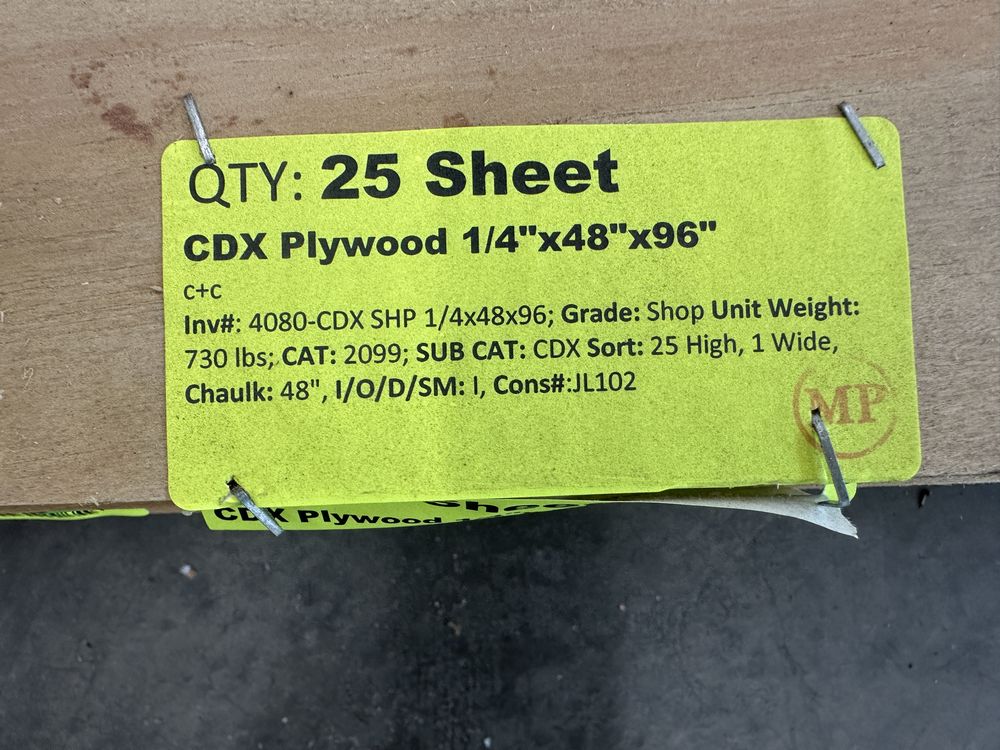 CDX Plywood 1/4"x48"x96". c+c, Grade: Shop. Weight: 730. Sold by: Sheet. Sold as: Price X Quantity. Inventory #: 4080-CDX SHP 1/4x48x96
