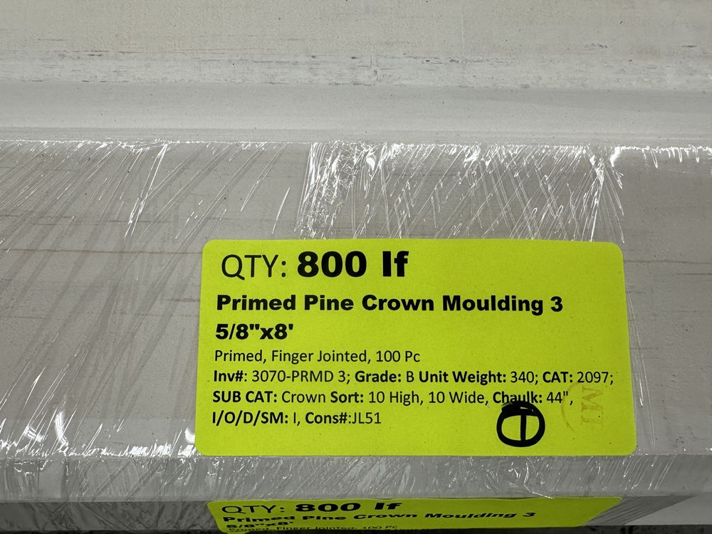 Primed Pine Crown Moulding 3 5/8"x8'. Primed, Finger Jointed, 100 pieces, Grade: B. Weight: 340. Sold by: Linear Foot. Sold as: Price X Quantity. Inventory #: 3070-PRMD 3