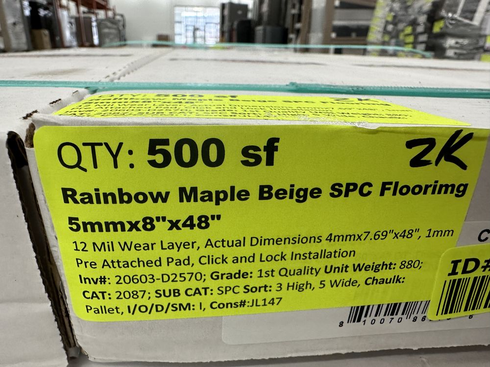 Rainbow Maple Beige SPC Flooring 5mmx8"x48". 12 Mil Wear Layer, Actual Dimensions 4mmx7.69"x48", 1mm Pre-Attached Pad, Click and Lock Installation, Grade: 1st Quality *2 boxes with some chipped planks, see photos*. Weight: 880. Sold by: Square Foot. Sold as: Price X Quantity. Inventory #: 20603-D2570