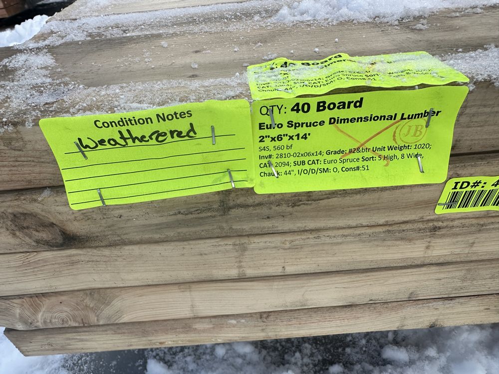 Euro Spruce Dimensional Lumber 2"x6"x14'. S4S, 560 Board Foot Grade: #2&btr *Weathered, See Photos*. Weight: 1020. Sold by: Board. Sold as: Price X Quantity. Inventory #: 2810-02x06x14