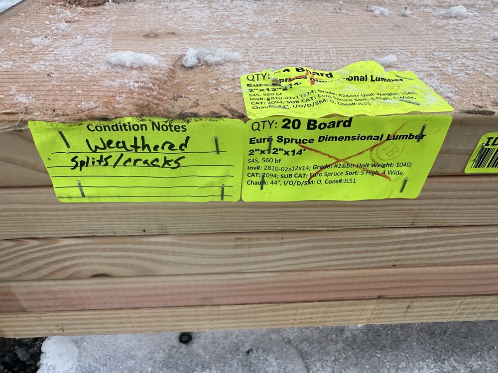 Euro Spruce Dimensional Lumber 2"x12"x14'. S4S, 560 Board Foot Grade: #2&btr *Weathered, Splits/Cracks See Photos*. Weight: 1040. Sold by: Board. Sold as: Price X Quantity. Inventory #: 2810-02x12x14