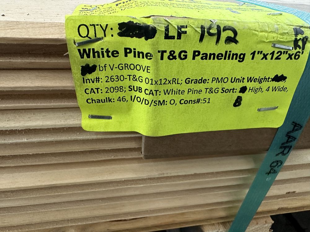 White Pine T&G Paneling 1"x12"x6'. V-Groove, 142 Board Foot, Grade: PMO. Weight: x. Sold by: Linear Foot. Sold as: Price X Quantity. Inventory #: 2630-T&G 01x12xRL