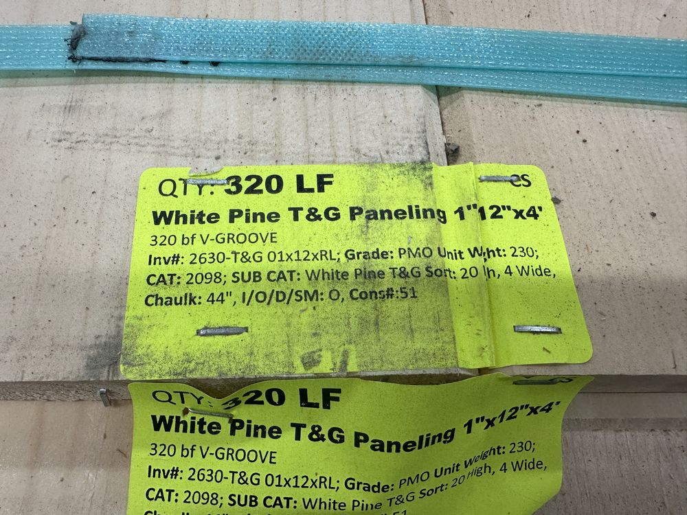 White Pine T&G 1"x12"x4'. 320 Board Foot, V-Groove, Grade: PMO. Weight: 230. Sold by: Linear Foot. Sold as: Price X Quantity. Inventory #: 2630-T&G 01x12xRL