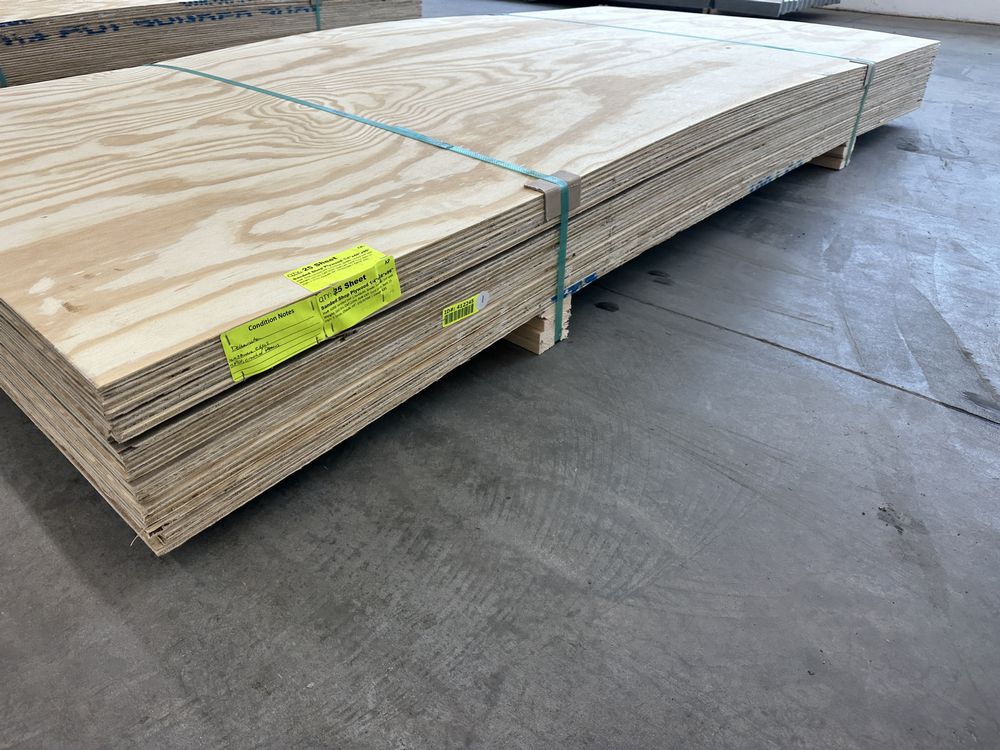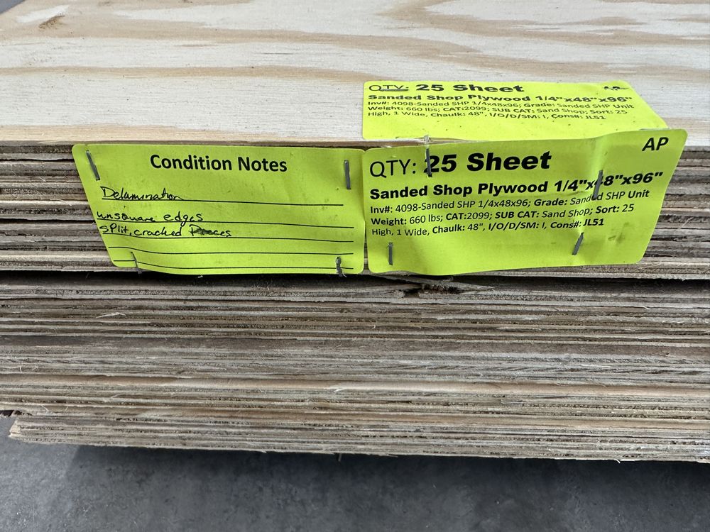 Sanded Shop Plywood 1/4"x48"x96". Sanded Shop *Delamination, Splits/Cracks, Unsquare edges, Please see photos*. Weight: 660. Sold by: Sheet. Sold as: Price X Quantity. Inventory #: 4098-Sanded SHP 1/4x48x96