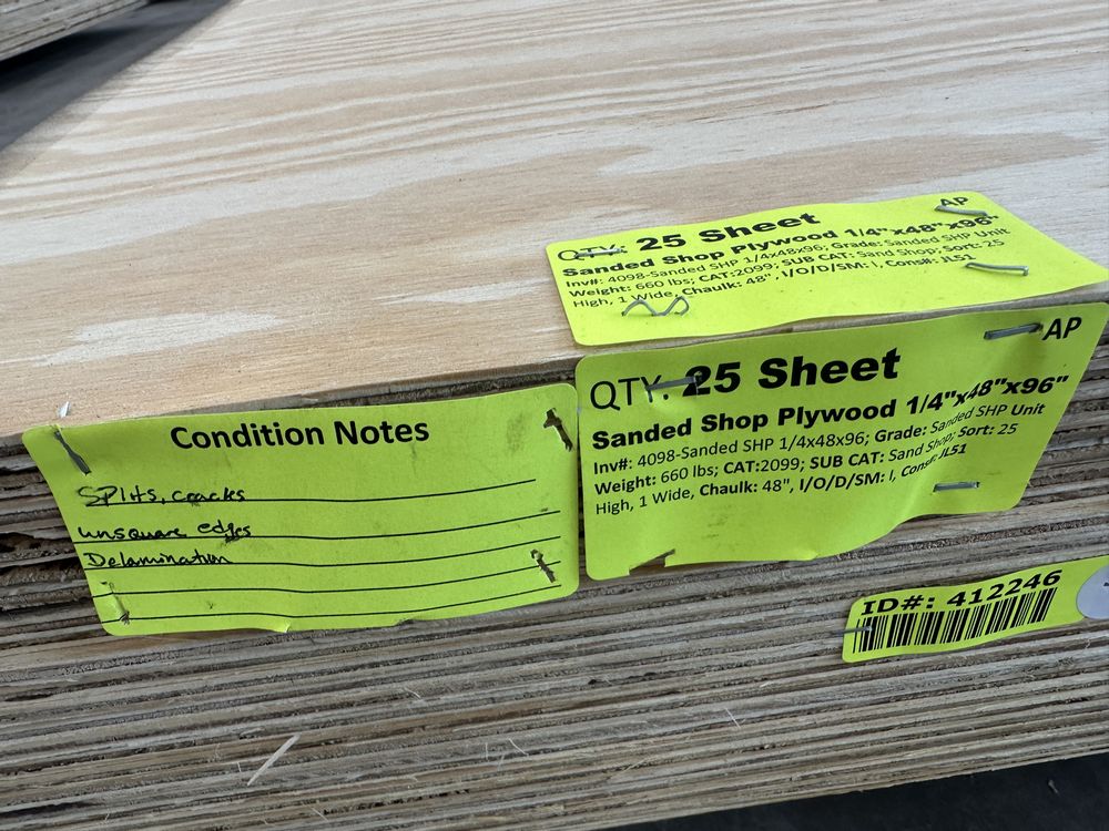 Sanded Shop Plywood 1/4"x48"x96". Sanded Shop *Delamination, Splits/Cracks, Unsquare edges, Please see photos*. Weight: 660. Sold by: Sheet. Sold as: Price X Quantity. Inventory #: 4098-Sanded SHP 1/4x48x96
