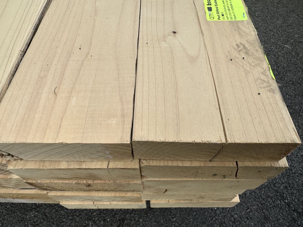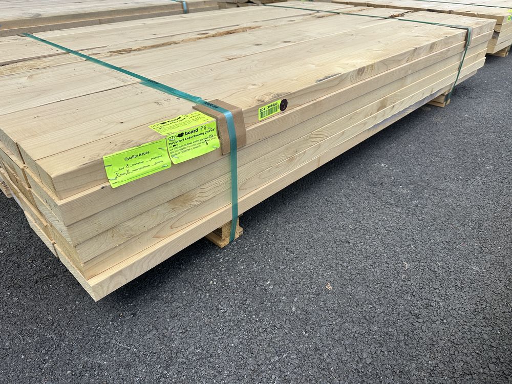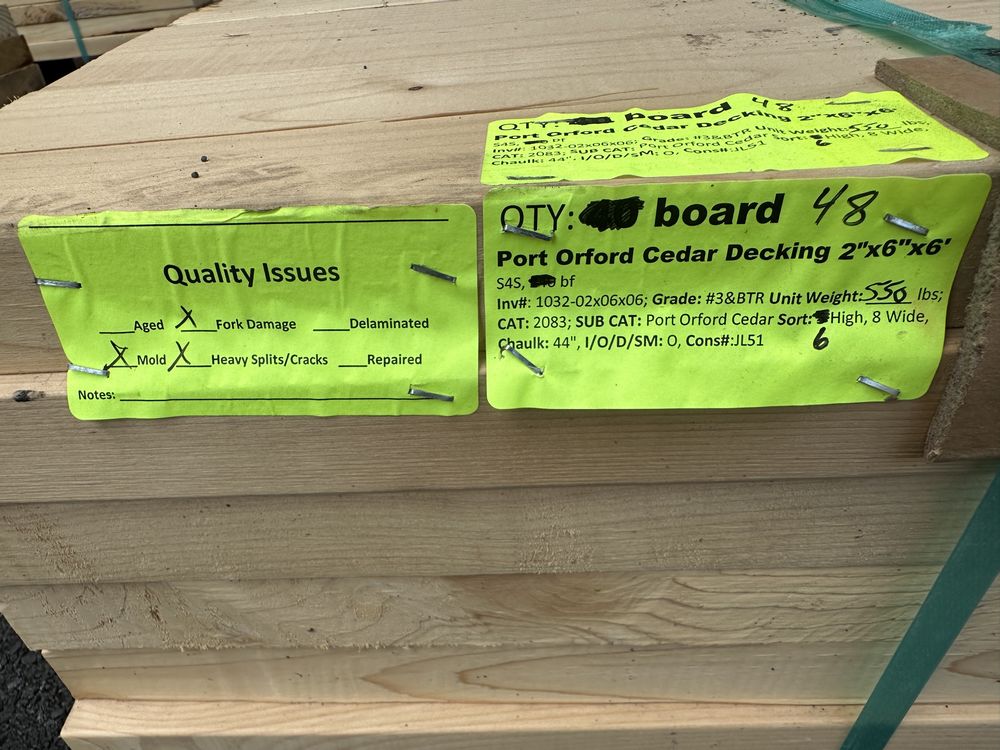 Port Orford Cedar Decking 2"x6"x6' **SEE DESCRIPTION**. Benefits & Advantages: Exceptional Strength – One of the hardest and strongest cedars, with great structural integrity. Naturally Decay-Resistant – Contains high levels of essential oils that prevent rot, insects, and mold. Pale, Bright Color – Almost white to light yellow, providing a clean, modern look that ages beautifully. Aromatic – Has a distinct, pleasant fragrance that repels insects and enhances the outdoor experience. Great for High-Traffic Areas – Due to its strength, it’s an excellent choice for decks that see heavy use. Auctioneers Notes: Port Orford Cedar Decking is the ultimate choice for strength, resilience, and natural beauty. With exceptional durability and inherent resistance to rot and insects, this premium decking is perfect for high-moisture environments. Its bright appearance and distinct aromatic properties add a touch of elegance to any outdoor space. A long-lasting investment for homeowners and contractors alike—place your bid today and secure top-tier quality! S4S, Grade: #3&BTR **Fork Damage, Mold, Heavy Splits/Cracks, SEE PHOTOS**. Weight: 550. Sold by: Board. Sold as: Price X Quantity. Inventory #: 1032-02x06x06