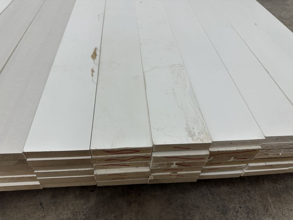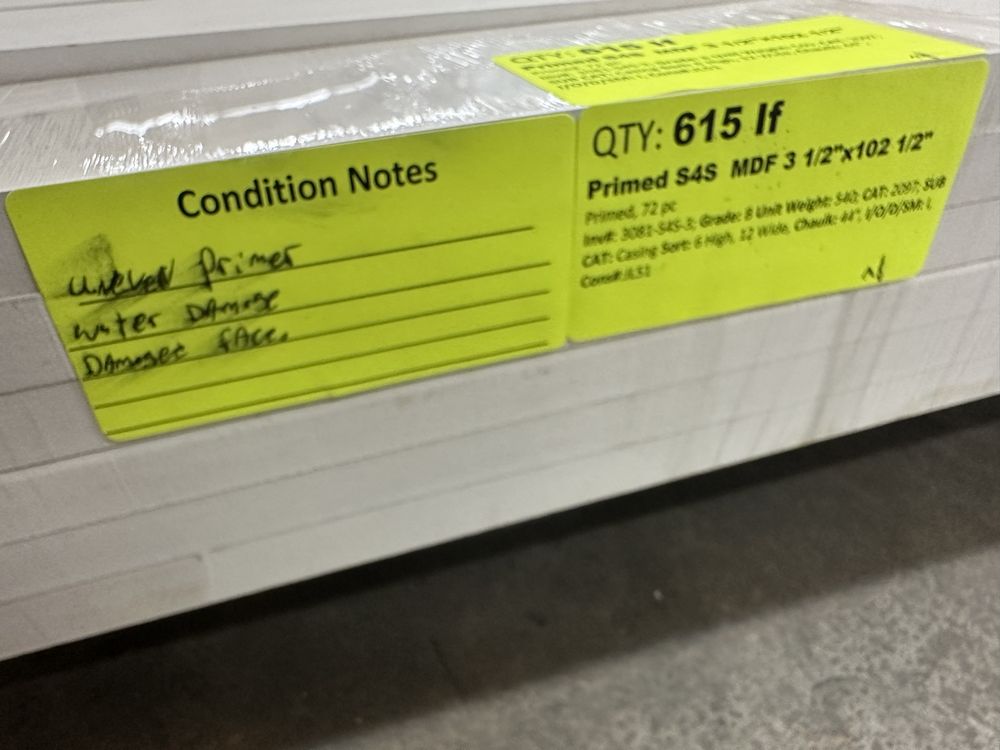 Primed S4S MDF 3 1/2"x102 1/2". Primed, 72 Pieces, Grade: B *Uneven Primer, Water Damage, Damaged Face, Please See Photos*. Weight: 540. Sold by: Linear Foot. Sold as: Price X Quantity. Inventory #: 3081-S4S-3
