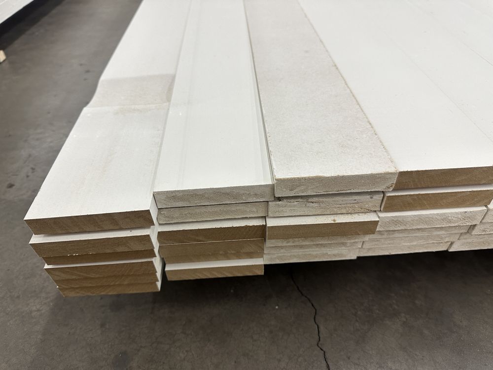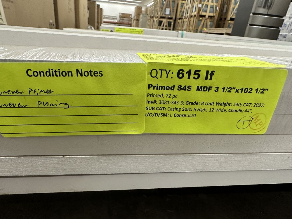 Primed S4S MDF 3 1/2"x102 1/2". Primed, 72 Pieces, Grade: B *Uneven Primer, Uneven Planing, Please See Photos*. Weight: 540. Sold by: Linear Foot. Sold as: Price X Quantity. Inventory #: 3081-S4S-3