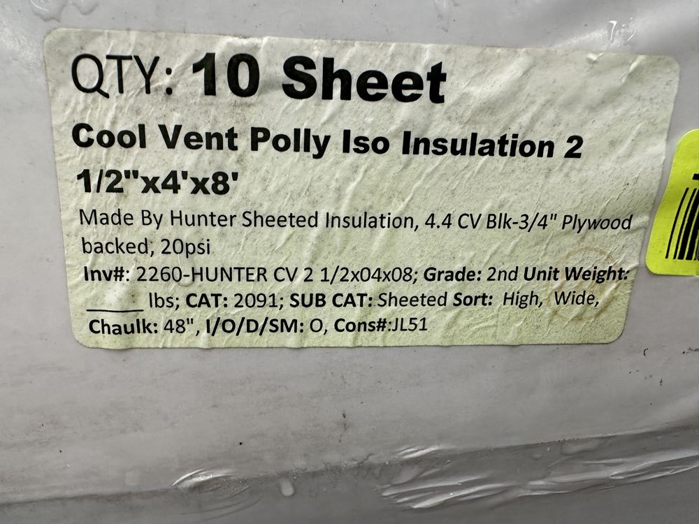 Cool Vent Poly Iso Insulation 2 1/2"x4'x8'. Made By Hunter Sheeted Insulation, 4.4CV Blk-3/4" Plywood Backed, 20psi Grade: 2nd. Weight: x. Sold by: Sheet. Sold as: Price X Quantity. Inventory #: 2260-HUNTER CV 2 1/2x04x08