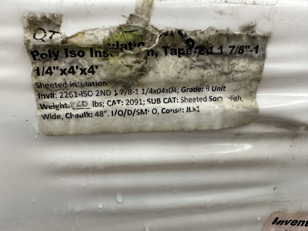 Poly Iso Insulation, Tapered 1 7/8"-1 1/4"x4'x4'. Sheeted Insulation, Grade: B *Some sheets scraped, see photos*. Weight: 260. Sold by: Sheet. Sold as: Price X Quantity. Inventory #: 2261-ISO 2ND 1 7/8-1 1/4x04x04